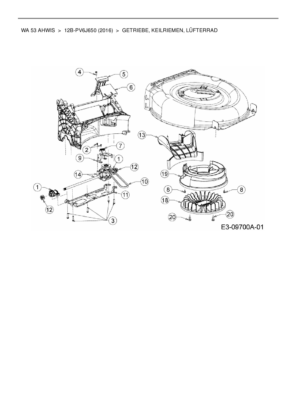 Download Ersatzteil-Zeichnung Wolf-Garten WA 53 AHWIS Zeichnung Getriebe, Keilriemen, Lüfterrad (PDF-Format)
