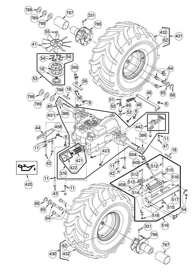 Getriebe hinten mit Rädern