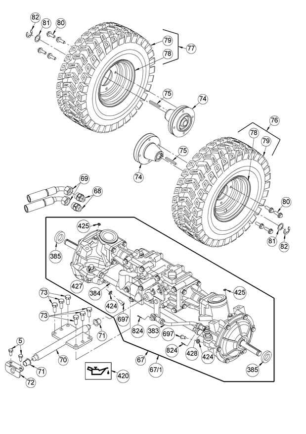 Getriebe vorn mit Rädern