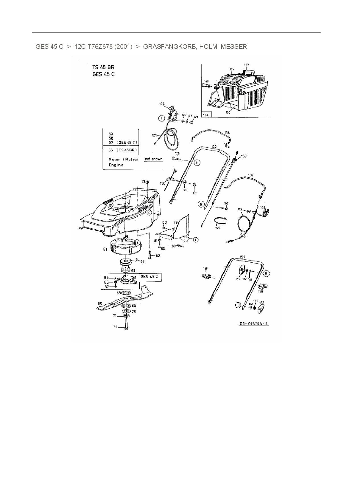 Ersatzteile für Motormäher mit Antrieb MTD GES 45 C aus der Zeichnung Grasfangkorb, Holm, Messer:
