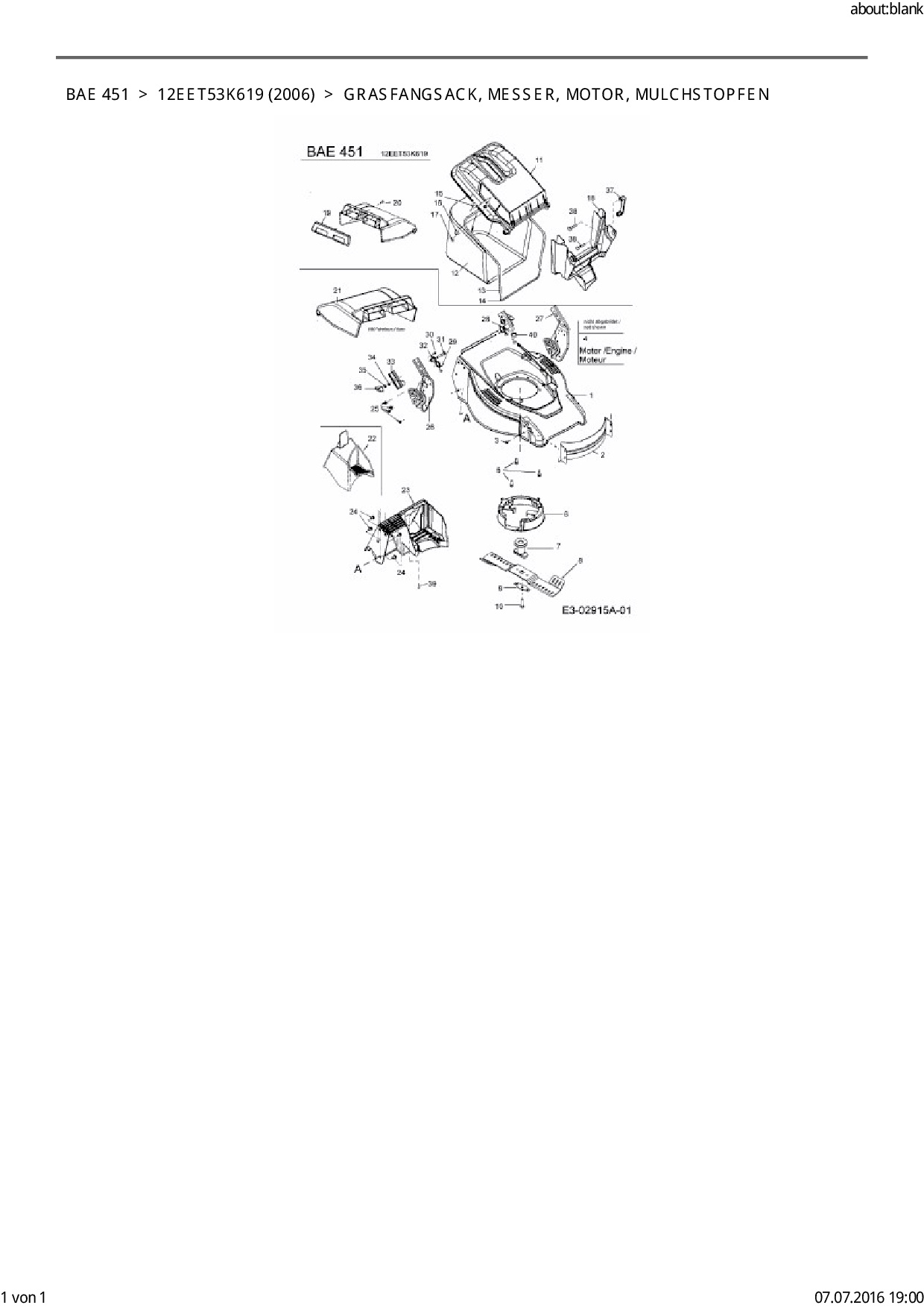 Ersatzteile für Motormäher mit Antrieb FLEURELLE BAE 451 aus der Zeichnung Grasfangsack, Messer, Motor, Mulchstopfen: