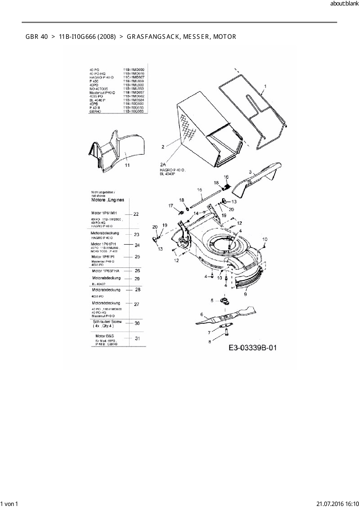 Ersatzteile für Motormäher Garda GBR 40 aus der Zeichnung Grasfangsack, Messer, Motor: