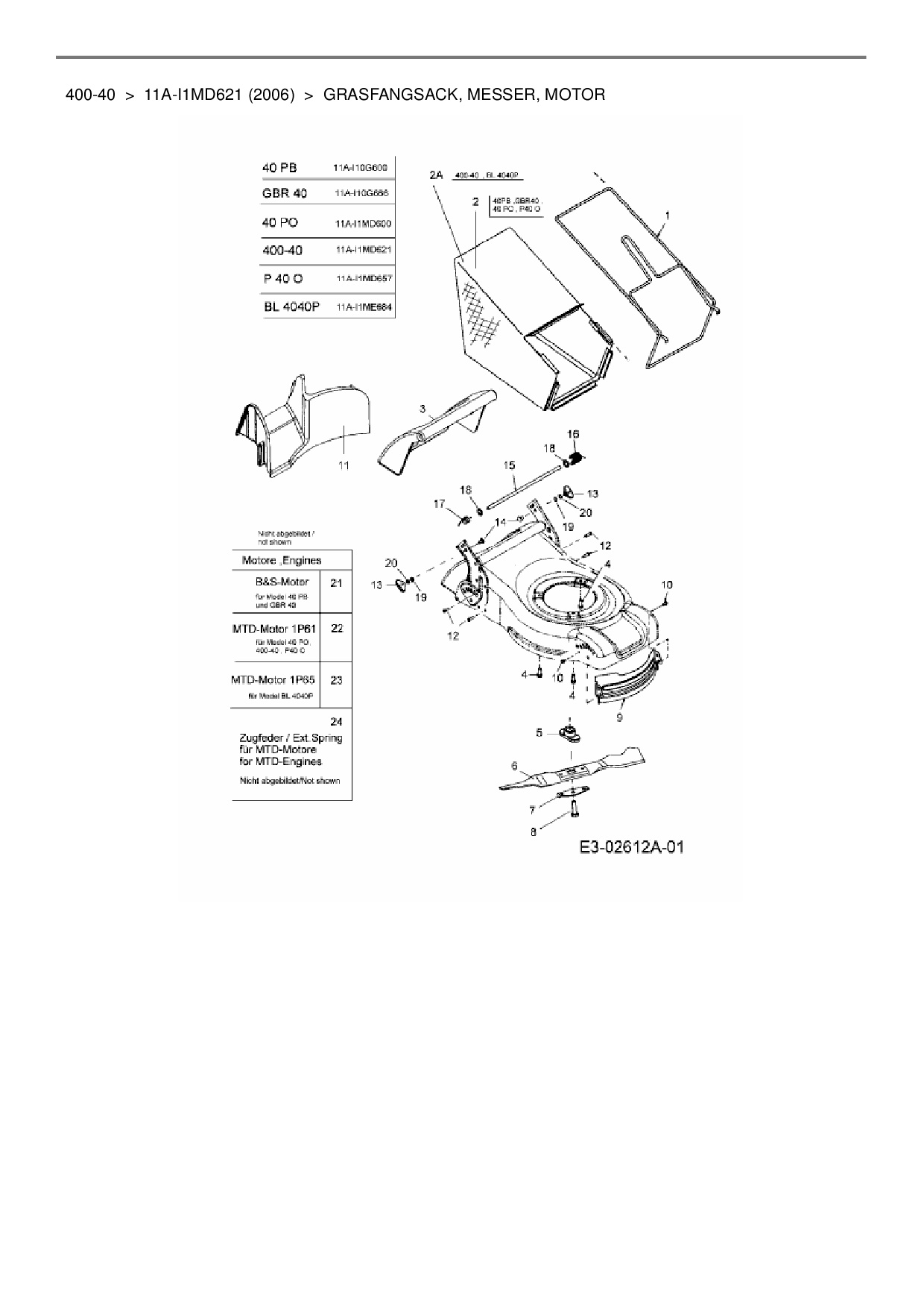 Ersatzteile für Motormäher Hanseatic 400-40 aus der Zeichnung Grasfangsack, Messer, Motor:
