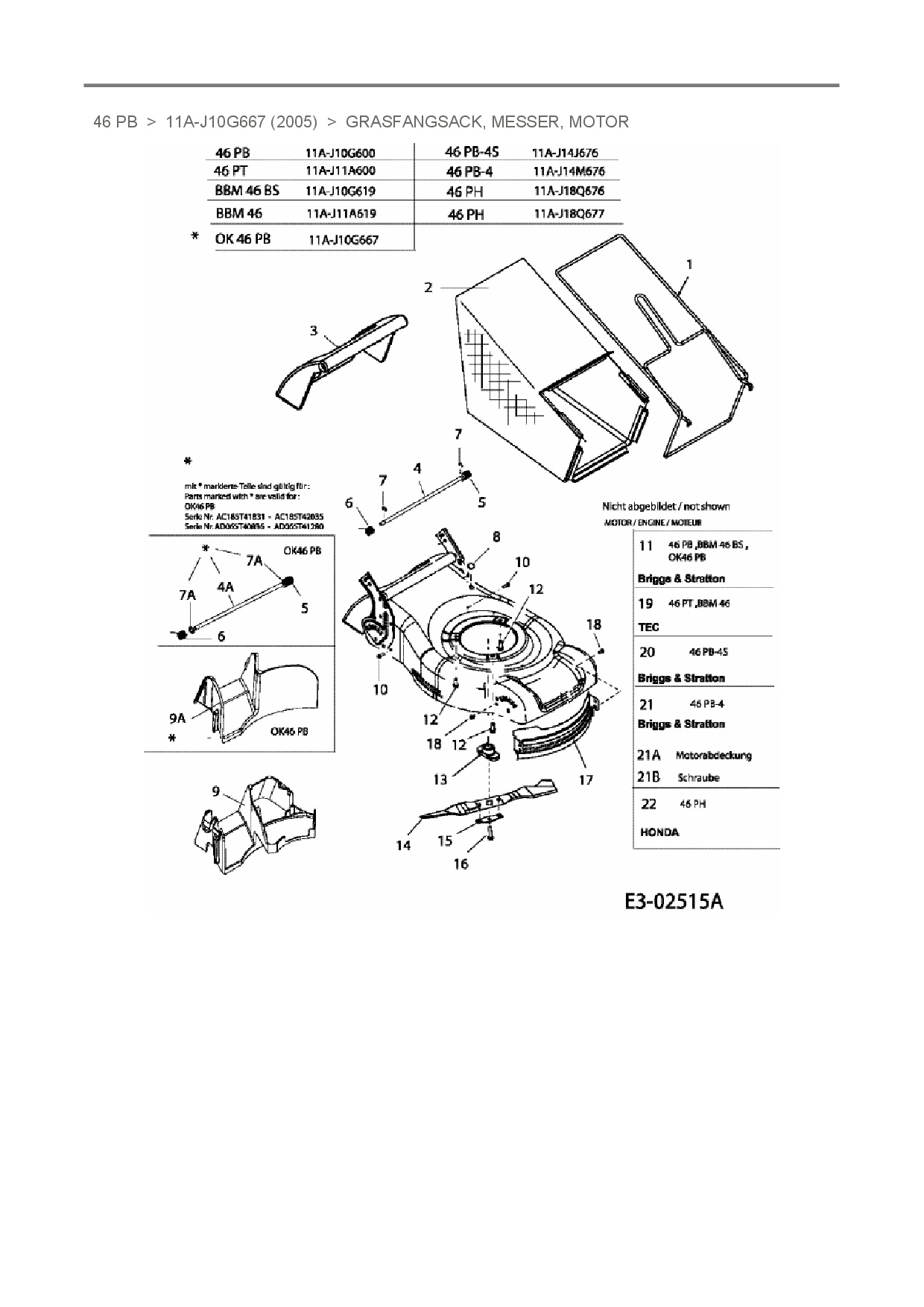 Ersatzteile für Motormäher OK 46 PB aus der Zeichnung Grasfangsack, Messer, Motor:
