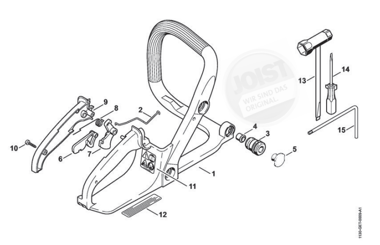 Hier finden Sie alle Ersatzteile von Stihl Benzin-Motorsägen 018 der Zeichnungsgruppe Griffrahmen, Werkzeuge: