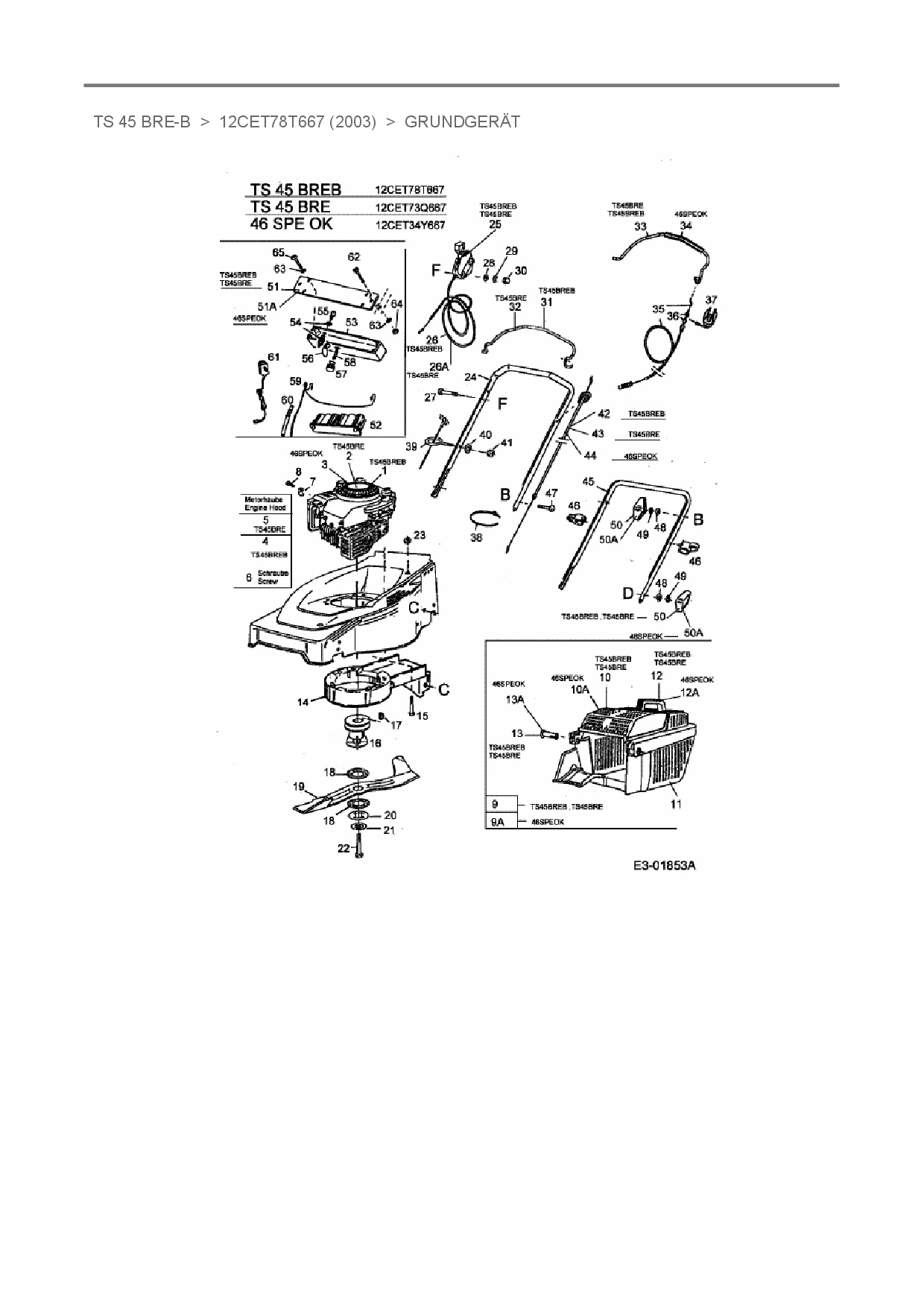 Zeichnung für Turbo-Silent Motormäher mit Antrieb TS 45 BRE-B mit der Geräte-Artikelnr. 12CET78T667 ab Baujahr 2003: