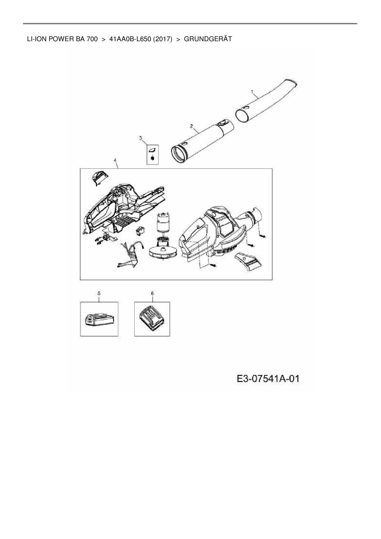 Zeichnung für Wolf-Garten Akkulaubbläser Li-Ion Power BA 700 mit der Geräte-Artikelnr. 41AA0B-L650 ab Baujahr 2017: