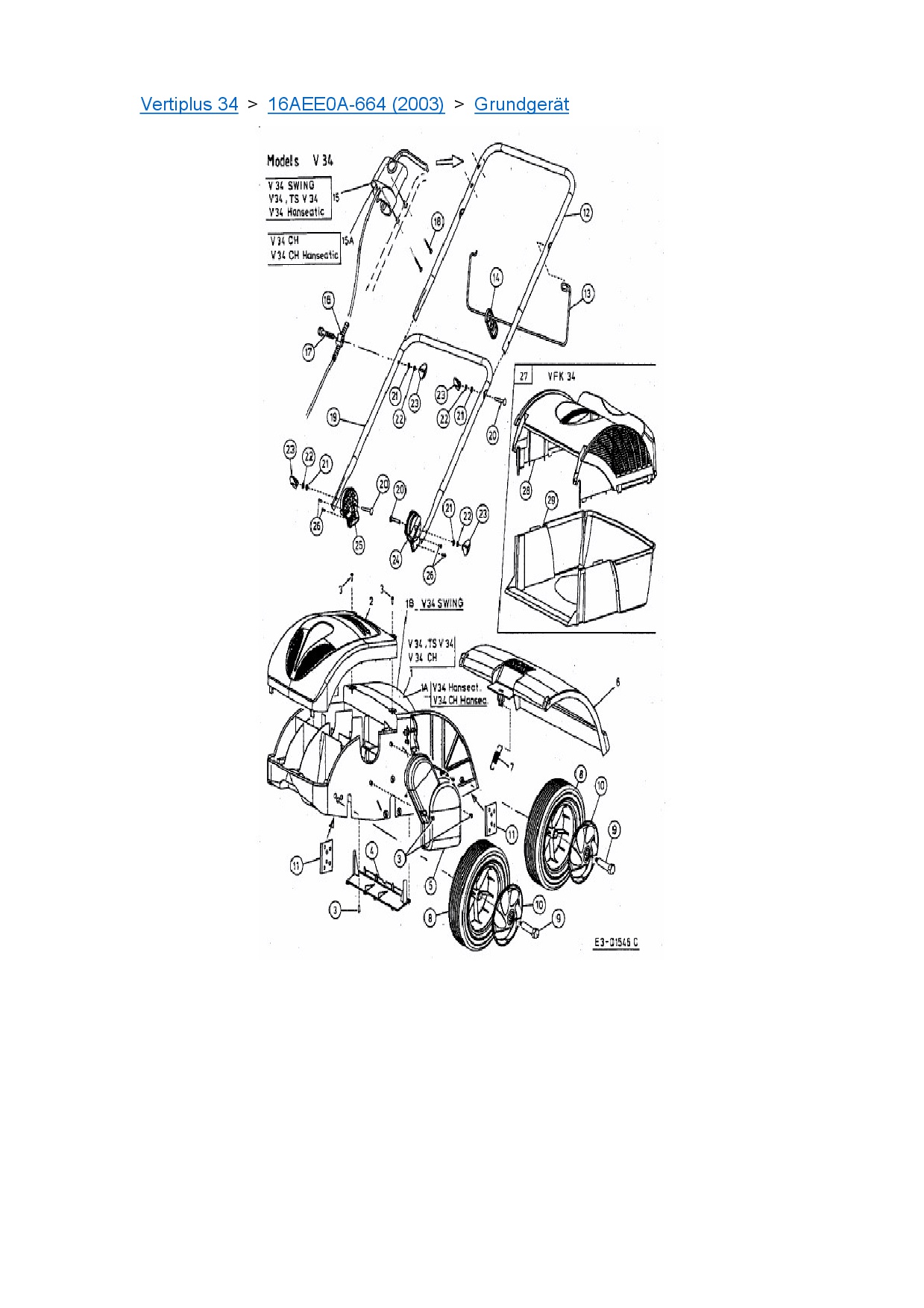 Zeichnung für MTD Elektrovertikutierer Vertiplus 34 mit der Geräte-Artikelnr. 16AEE0A-664 ab Baujahr 2003: