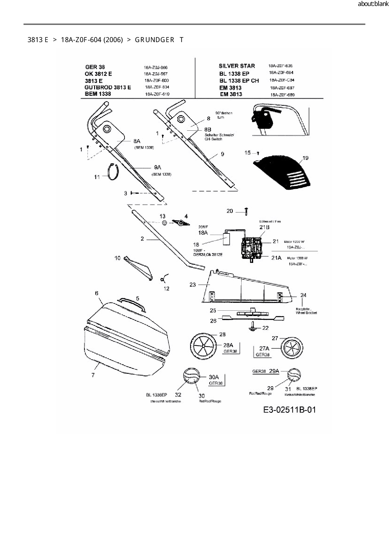 Zeichnung für Gutbrod Elektromäher 3813 E mit der Geräte-Artikelnr. 18A-Z0F-604 ab Baujahr 2006: