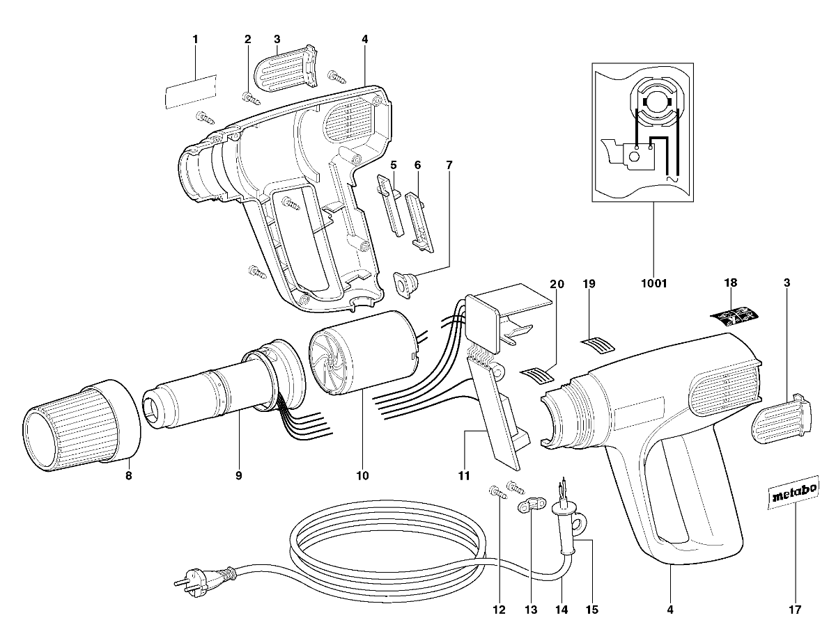 Zeichnung 1 Sollten Sie Fragen zu einem Ersatzteil von Metabo HE 2000 Heissluft-Gebläse 602005190 haben, können Sie uns gerne eine E-Mail (mit einem Foto vom Typenschild Ihres Gerätes) schreiben oder eine Ersatzteilanfrage stellen.