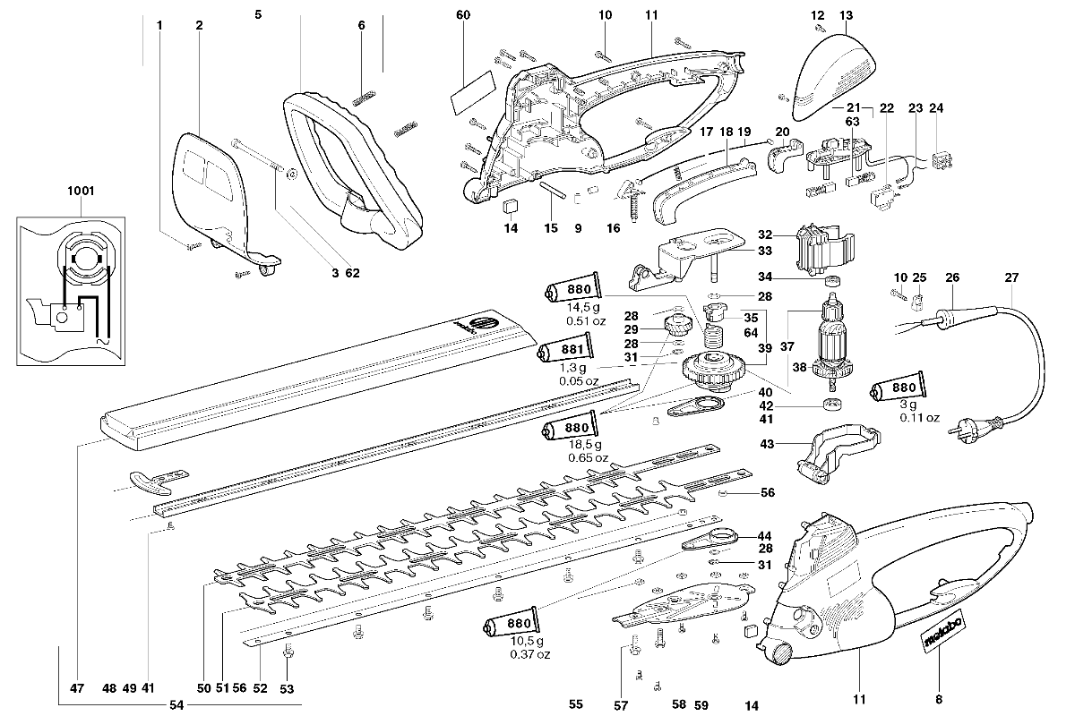 Zeichnung 1 Sollten Sie Fragen zu einem Ersatzteil von Metabo HS 8465 S Heckenschere 608465190 haben, können Sie uns gerne eine E-Mail (mit einem Foto vom Typenschild Ihres Gerätes) schreiben oder eine Ersatzteilanfrage stellen.