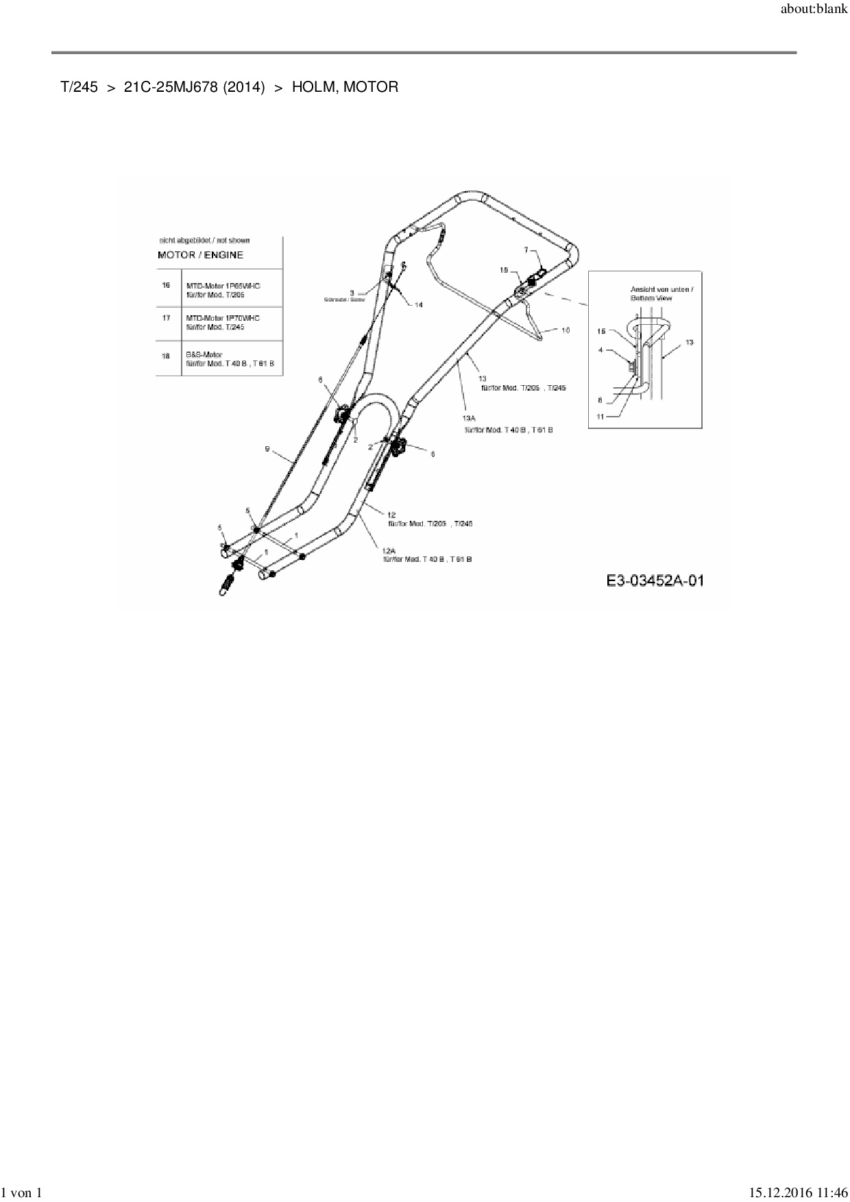 Ersatzteile für Motorhacke MTD T/245 aus der Zeichnung Holm, Motor: