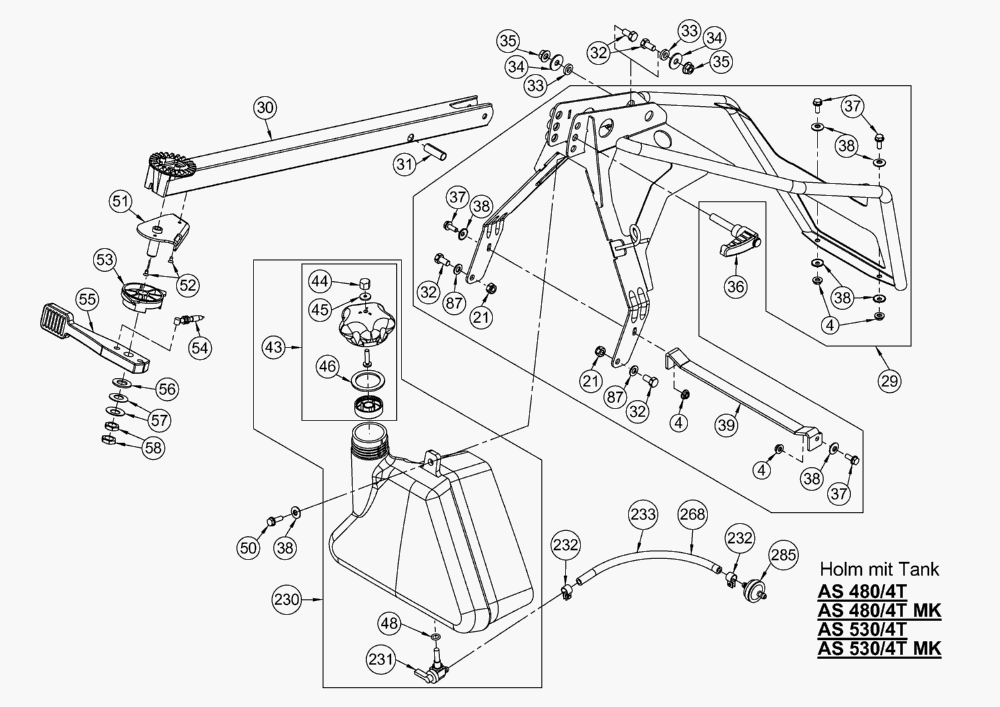Hier finden Sie alle Ersatzteile von AS-Motor Profi-Rasenmäher AS 530/4T ab FNr. 019508050001 aus dem Zeichnungsblatt Holm mit Tank: