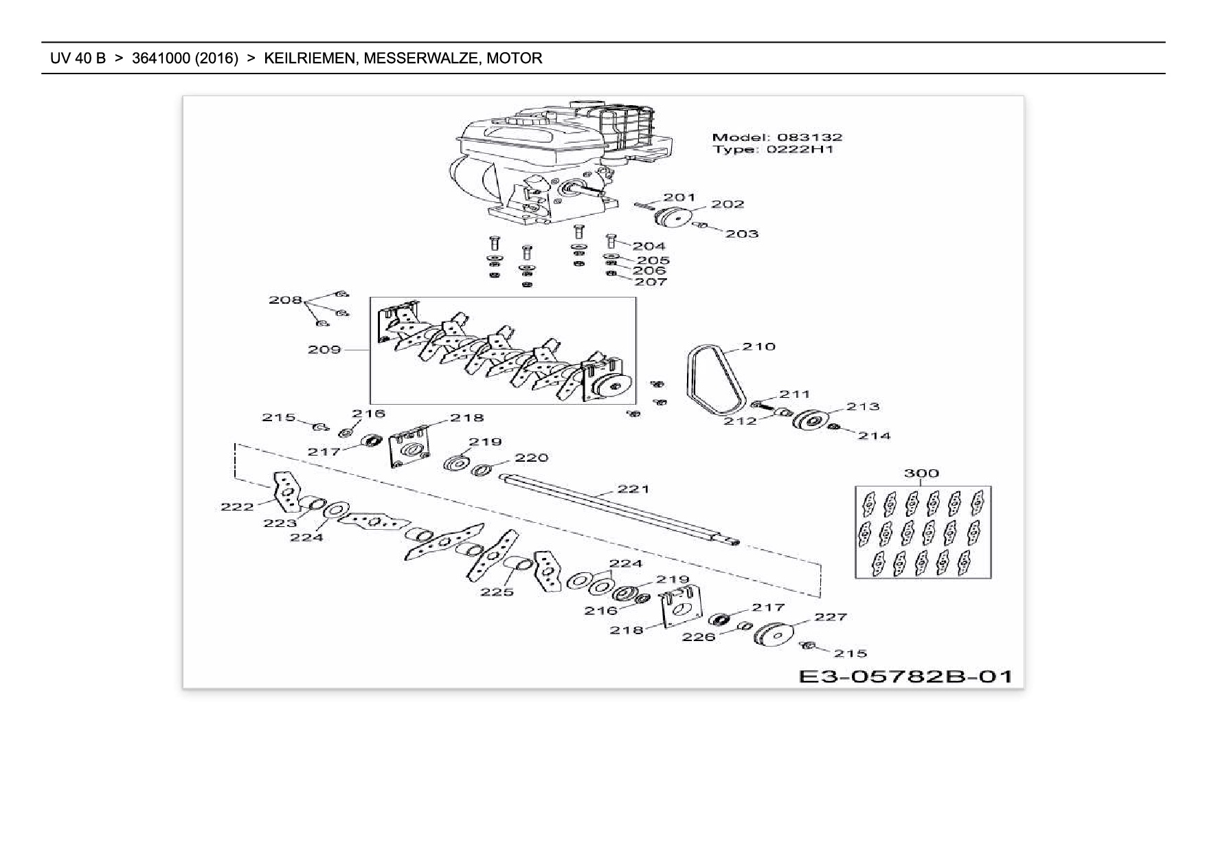Ersatzteile für Motorvertikutierer Wolf-Garten UV 40 B aus der Zeichnung Keilriemen, Messerwalze, Motor: