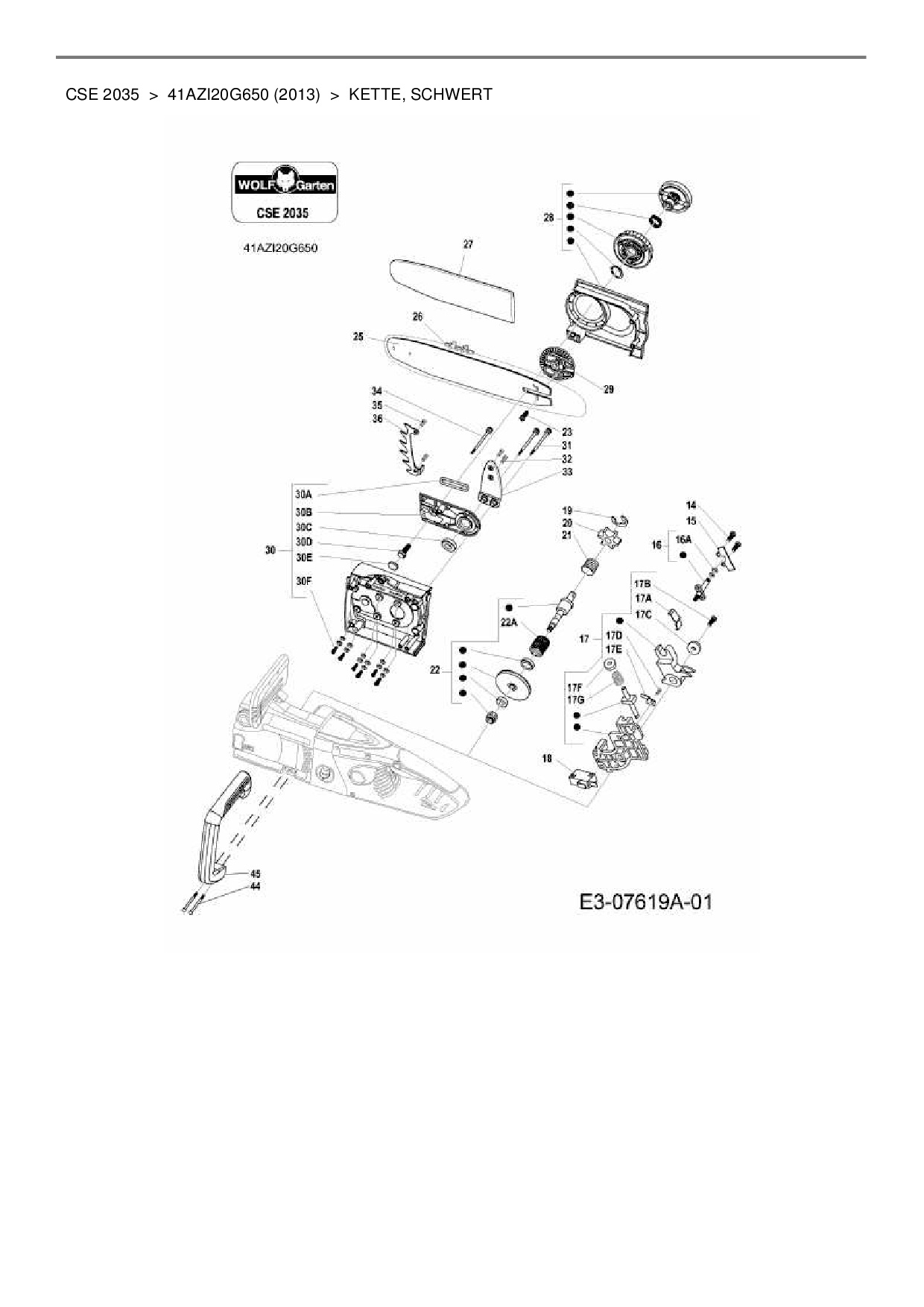 Zeichnung für Wolf-Garten Elektrokettensäge CSE 2035 mit der Geräte-Artikelnr. 41AZI20G650 ab Baujahr 2013: