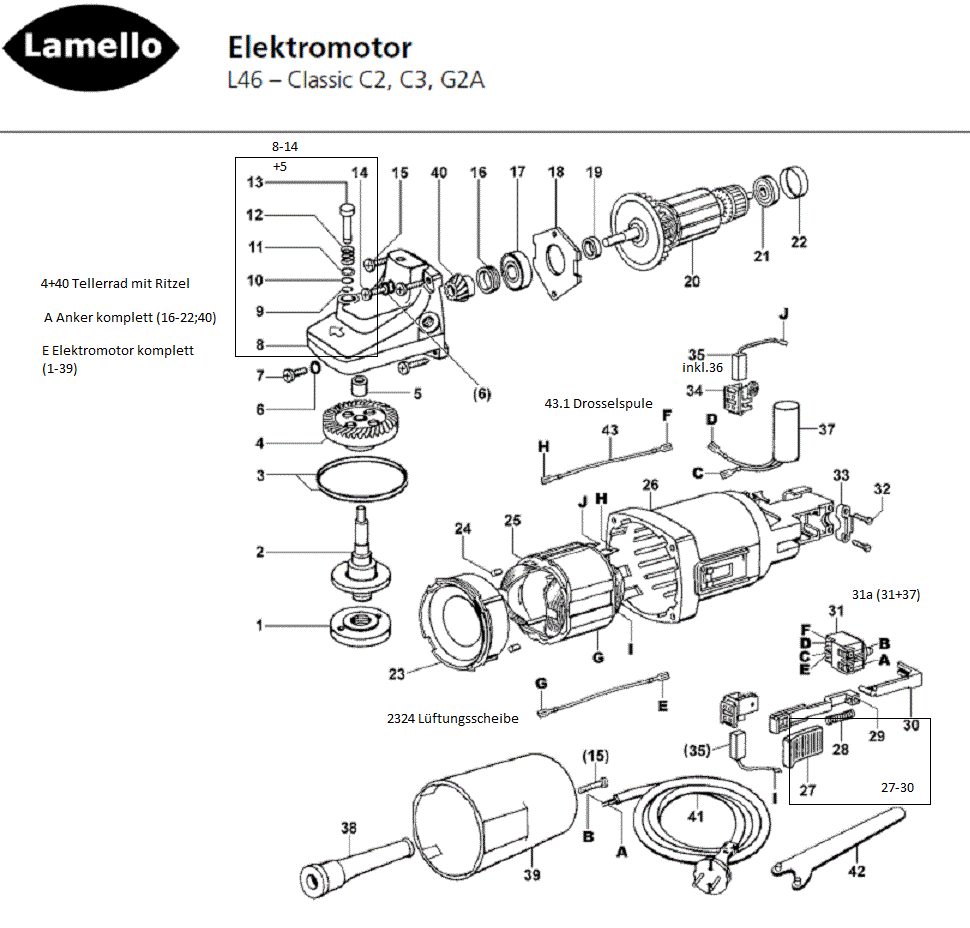 Folgende Ersatzteile für Lamello L46 - Motor für Classic C2, C3, G2A können Sie hier bestellen:
