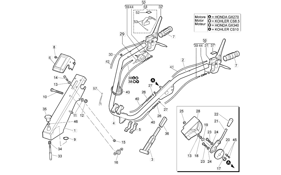 Hier finden Sie alle Ersatzteile für Oleo-Mac Schlegelmulcher WB 80 HR 11 aus der Zeichnung für Lenkstange und Bedienung: