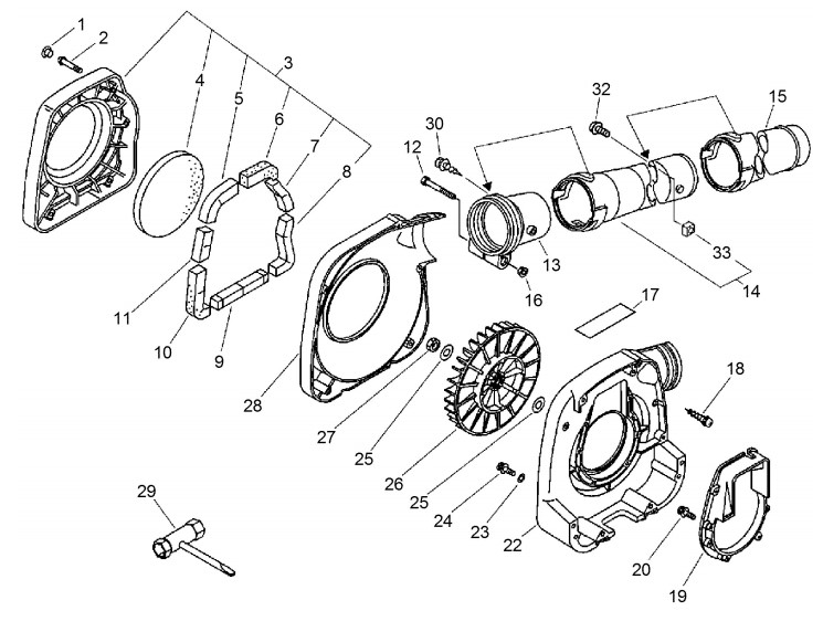Zeichnung von ECHO Laubbläser, tragbar PB-24LN Lüfter, -gehäuse, Rohre, Werkzeug: