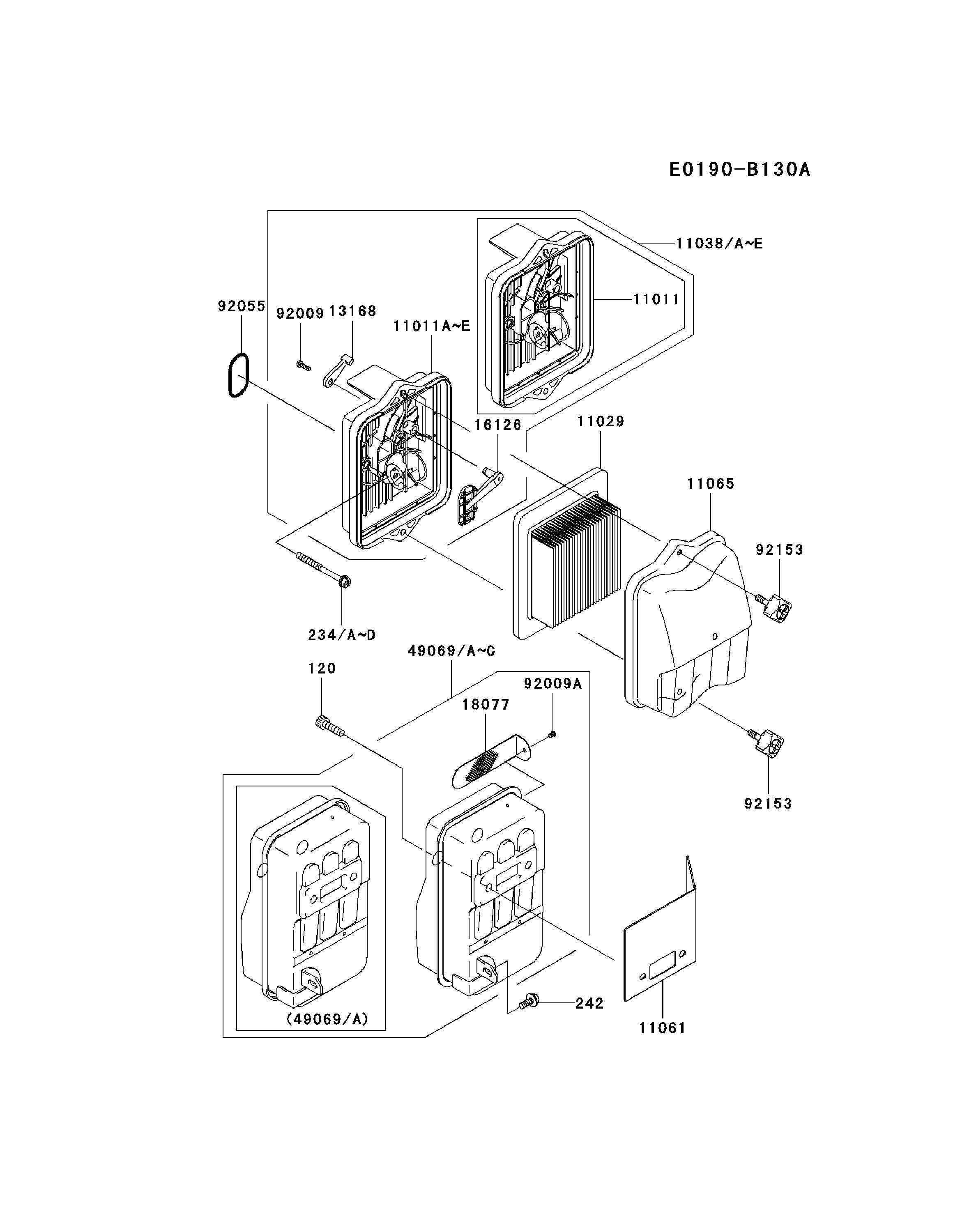 Hier finden Sie alle Ersatzteile von Kawasaki Laubbläser HG750A-BS00 (KRB750B) aus der Zeichnung Luftfilter/Auspuff: