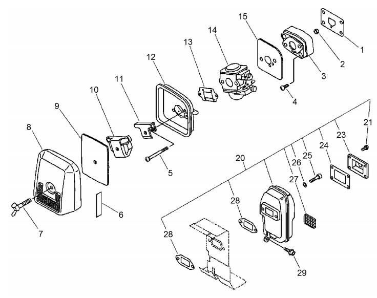 Zeichnung von ECHO Laubbläser, tragbar PB-24LN Luftfilter, Auspuff:
