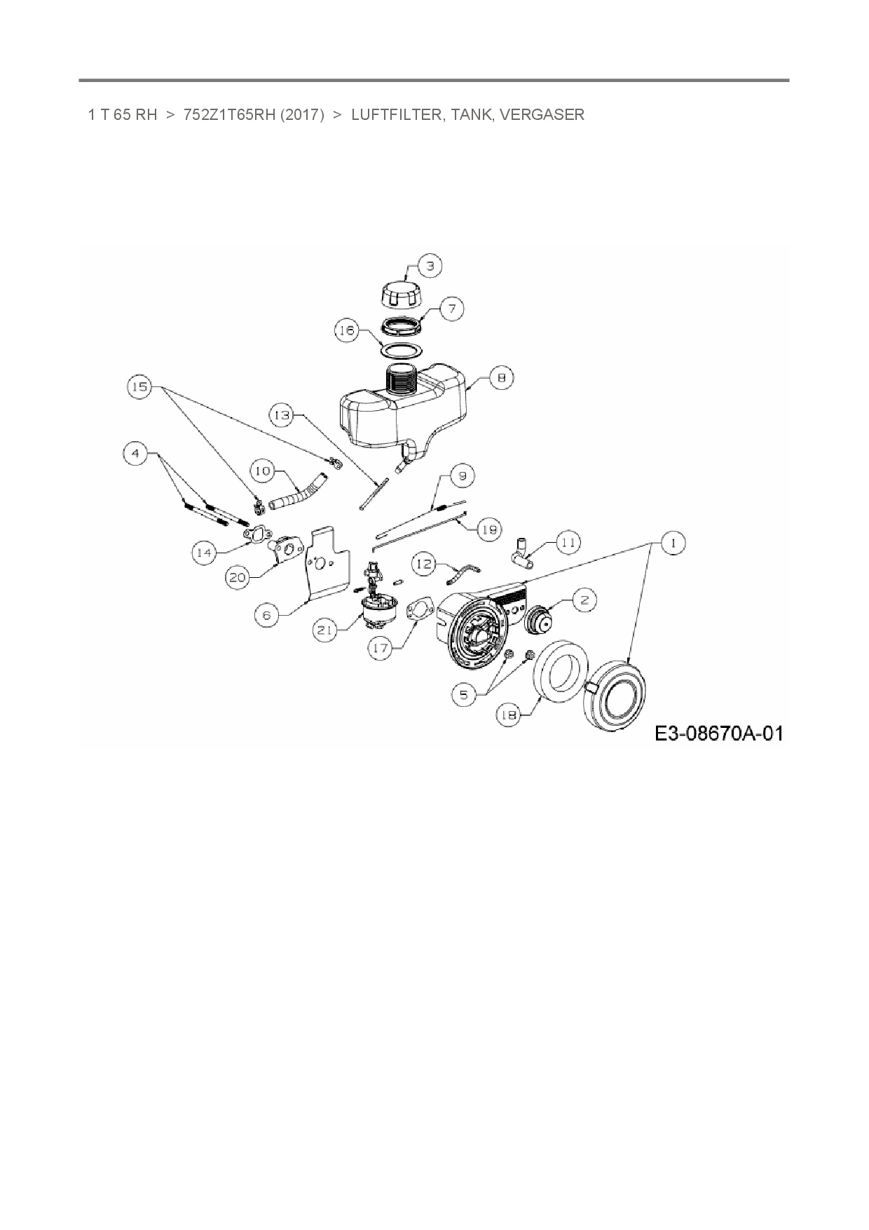 Ersatzteile für Vertikal MTD-Motoren 1 T 65 RH aus der Zeichnung Luftfilter, Tank, Vergaser: