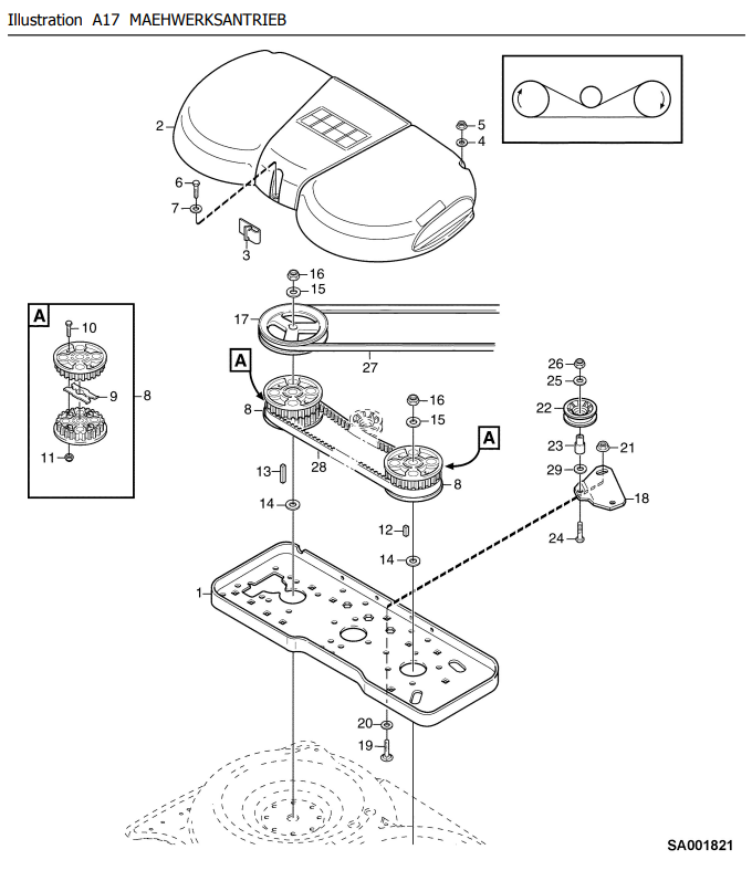 Zeichnung Sabo Rasentraktoren Frontmäher Mähdeck 92M (92-14 HF) Mähwerkantrieb: