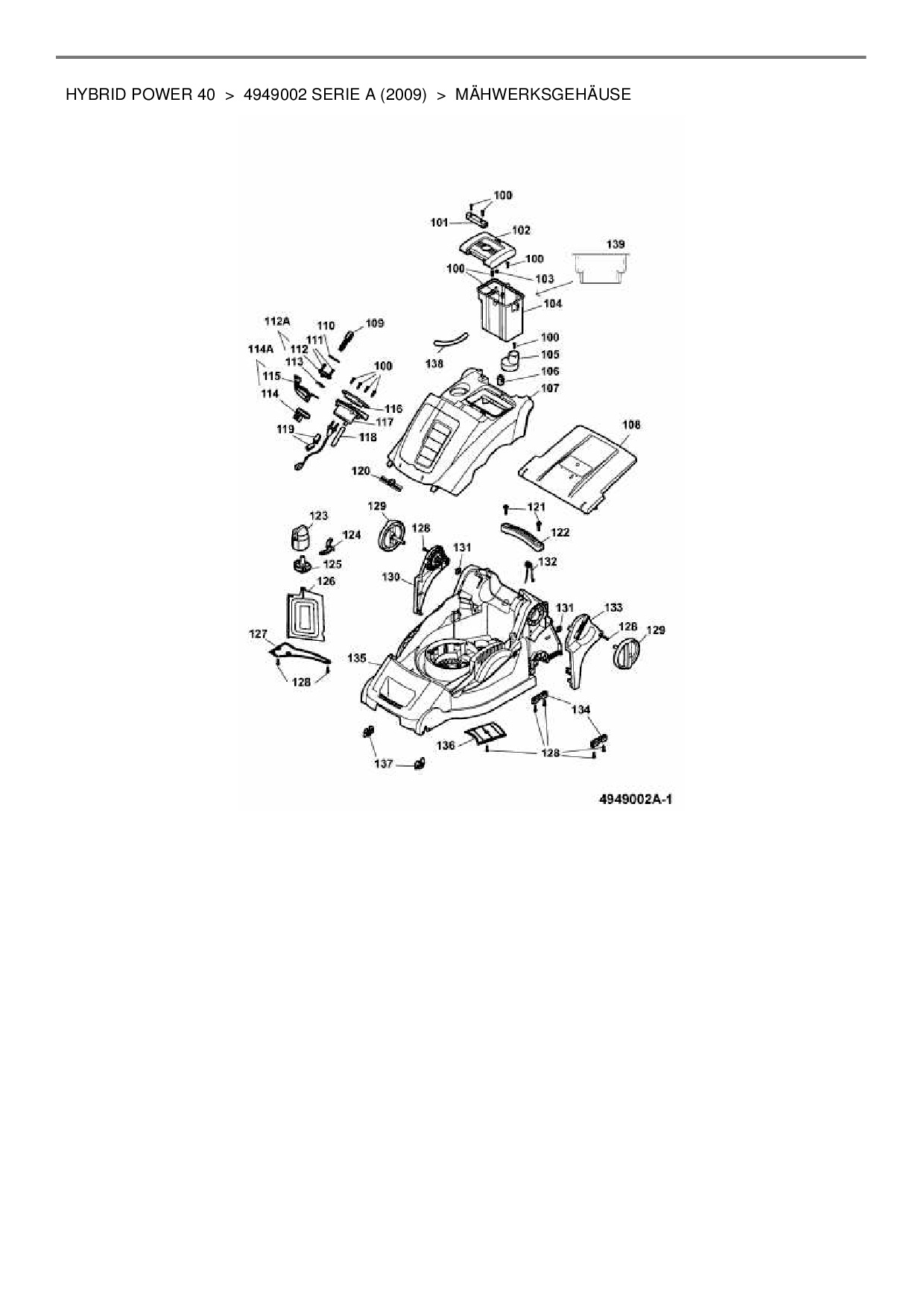 Zeichnung für Wolf-Garten Hybridmäher Hybrid Power 40 mit der Geräte-Artikelnr. 4949002 Serie A ab Baujahr 2009:
