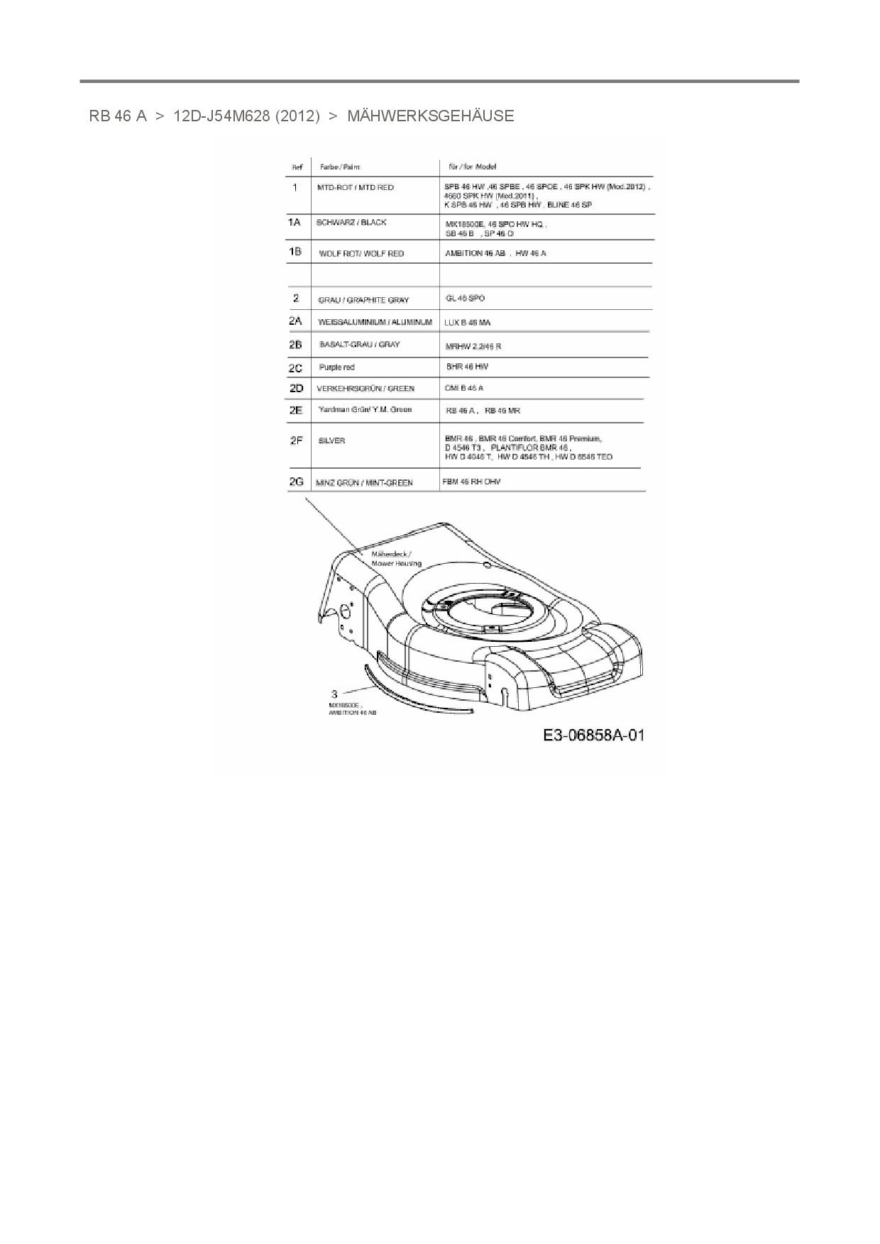 Ersatzteile für Motormäher mit Antrieb Raiffeisen-Markt RB 46 A aus der Zeichnung Mähwerksgehäuse:
