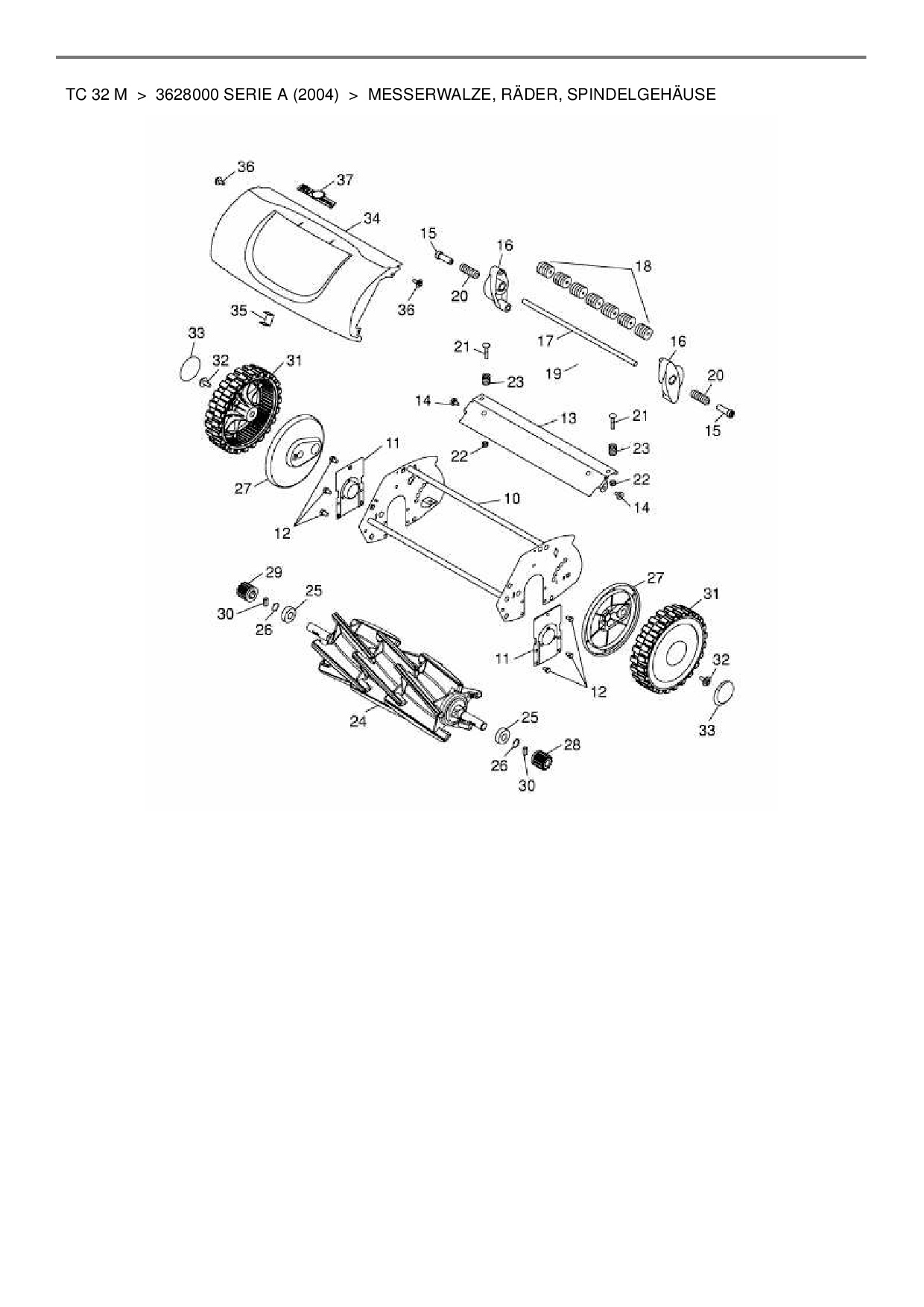 Ersatzteile für Spindelmäher Wolf-Garten TC 32 M aus der Zeichnung Messerwalze, Räder, Spindelgehäuse: