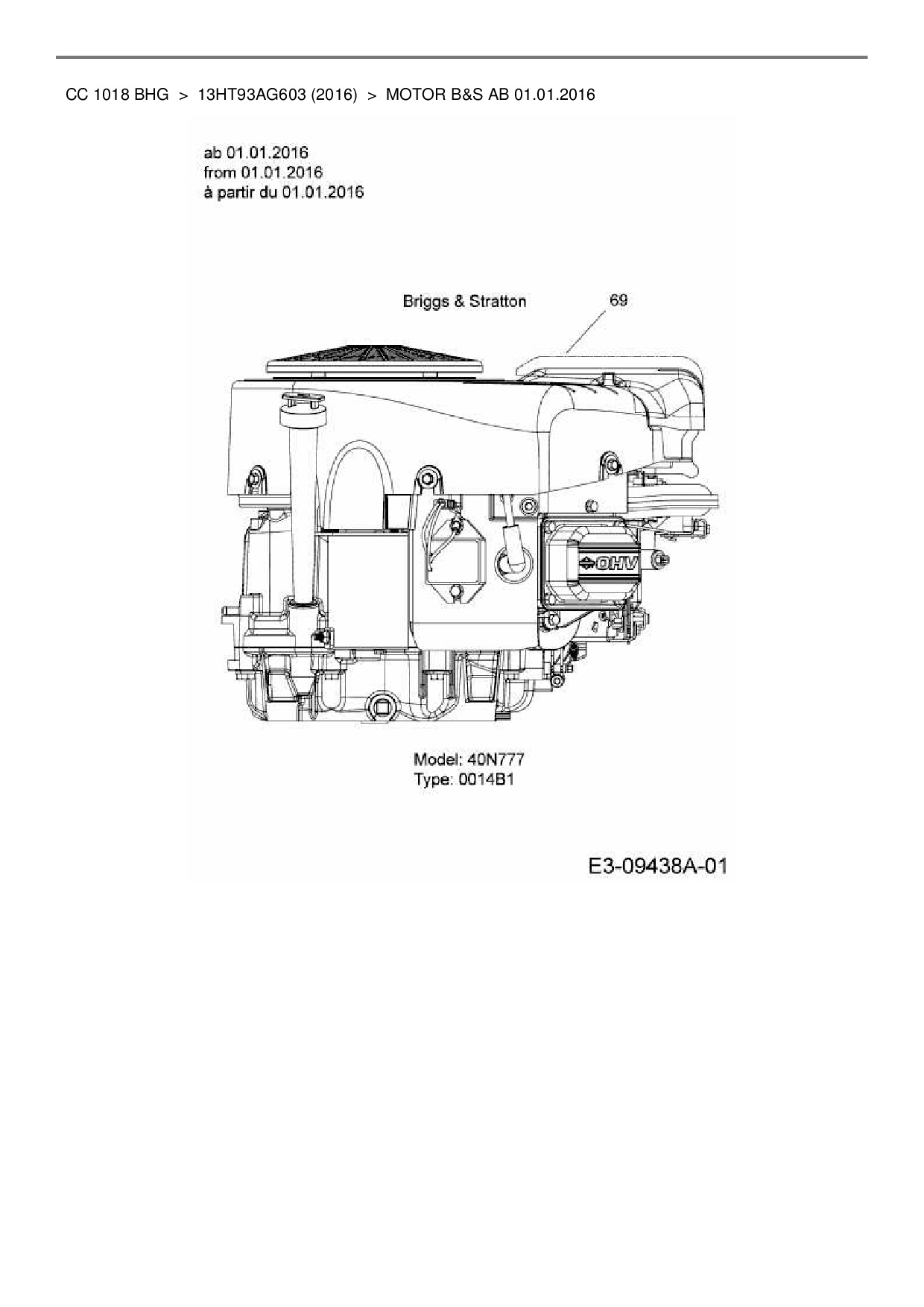 Ersatzteile für Rasentraktor Cub Cadet CC 1018 BHG aus der Zeichnung Motor B&S ab 01.01.2016: