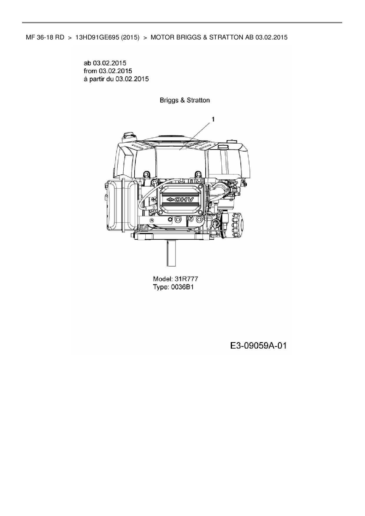 Ersatzteile für Rasentraktor Massey Ferguson MF 36-18 RD aus der Zeichnung Motor Briggs & Stratton ab 03.02.2015: