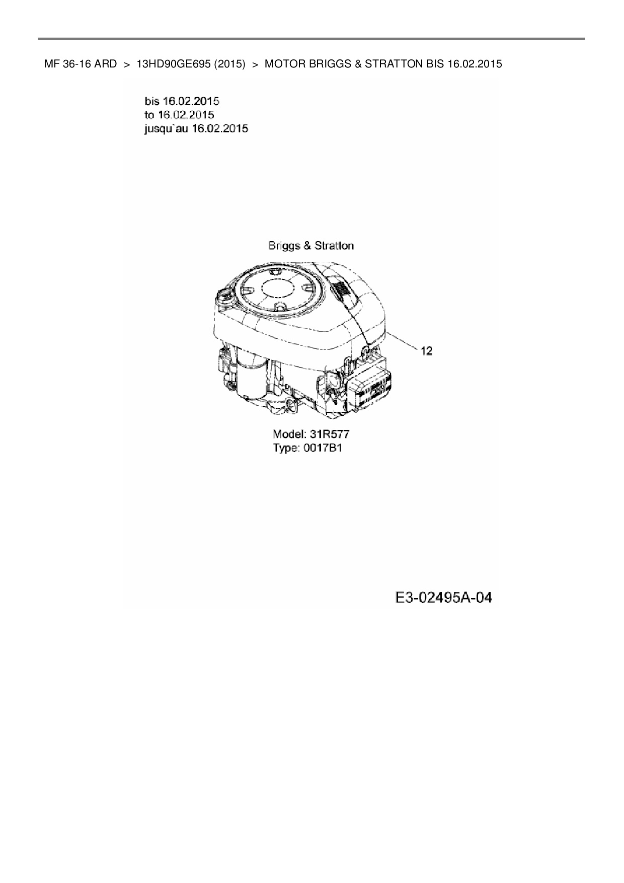 Ersatzteile für Rasentraktor Massey Ferguson MF 36-16 ARD aus der Zeichnung Motor Briggs & Stratton bis 16.02.2015: