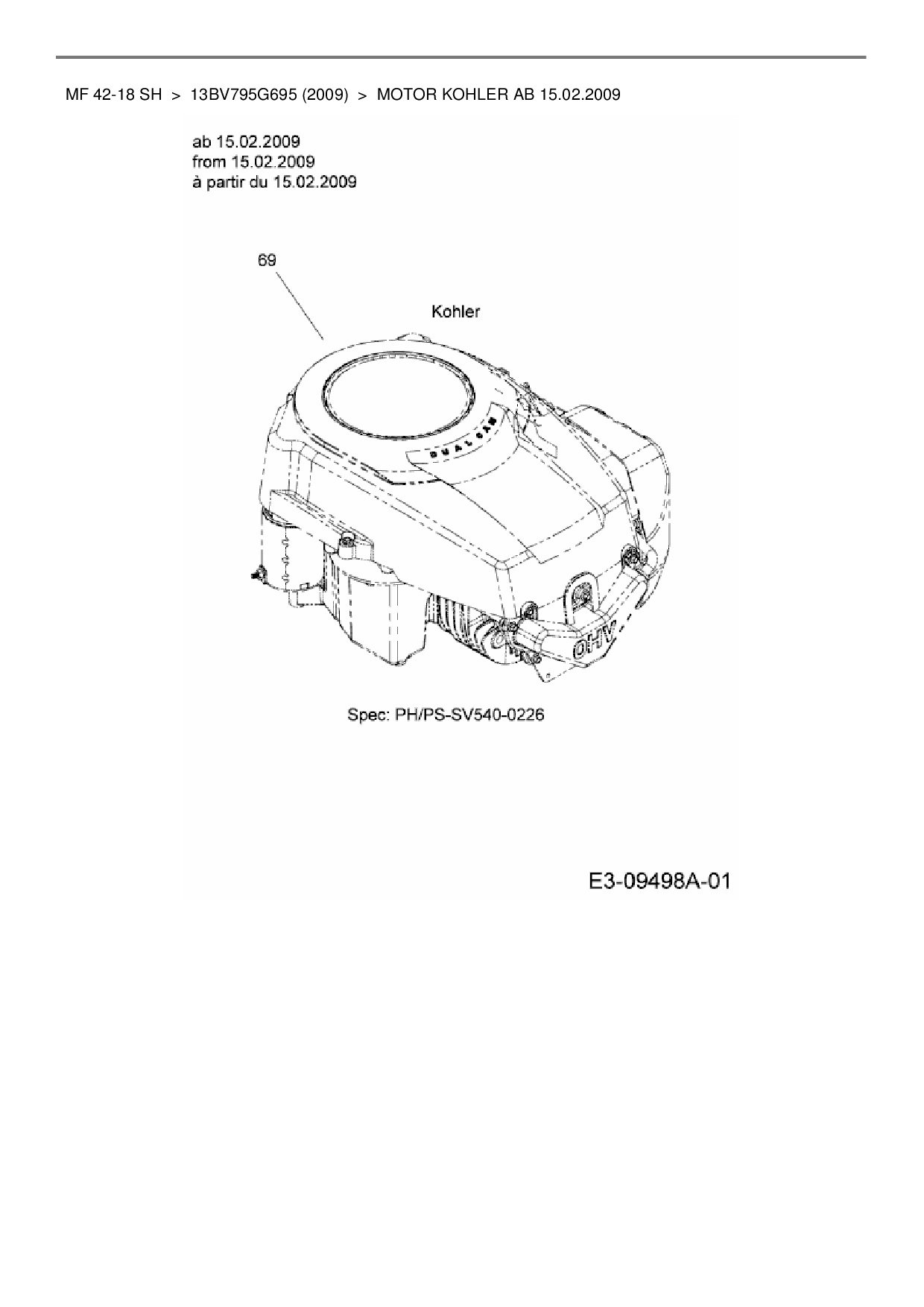 Ersatzteile für Rasentraktor Massey Ferguson MF 42-18 SH aus der Zeichnung Motor Kohler ab 15.02.2009: