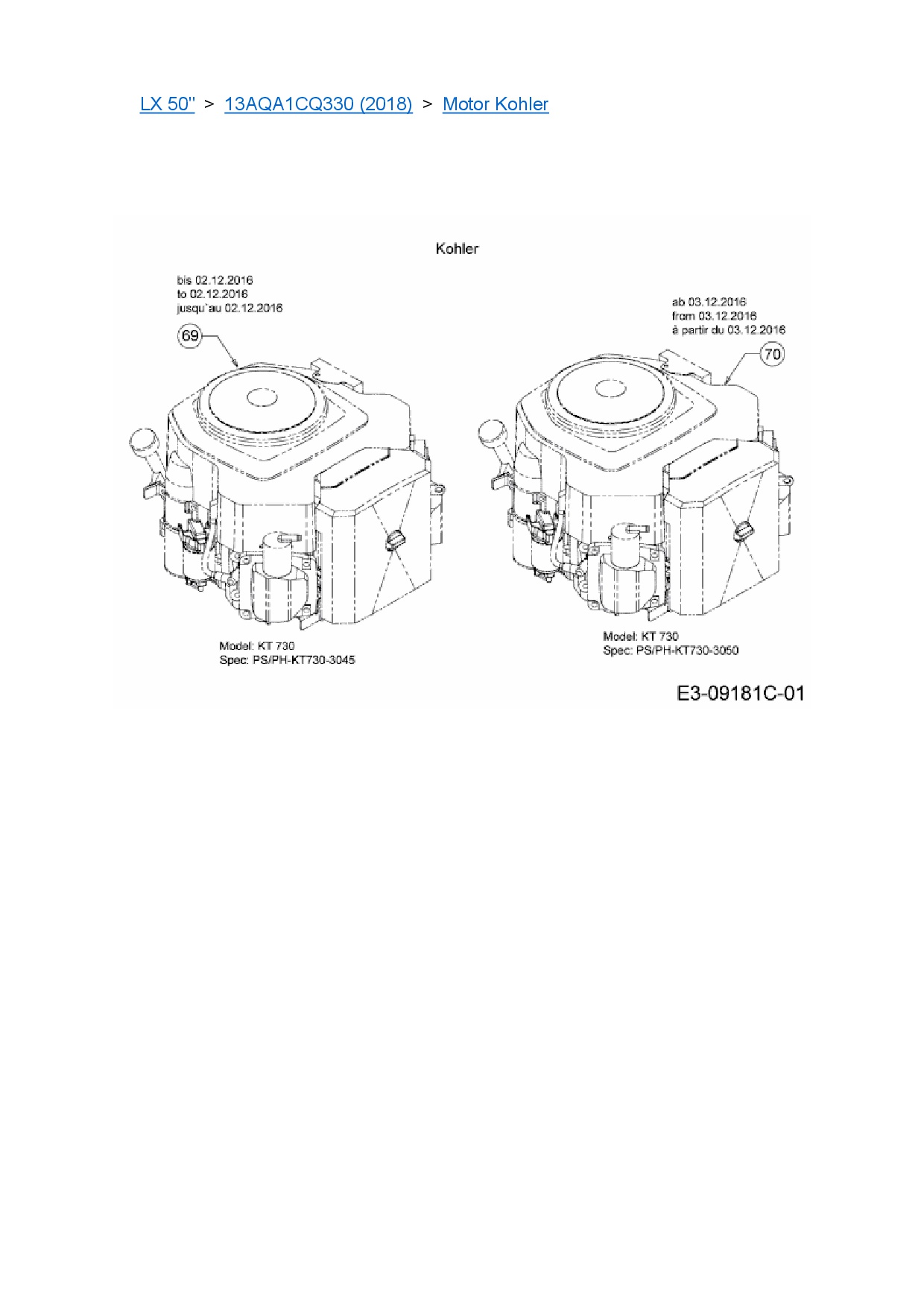 Ersatzteile für Rasentraktor Cub Cadet LX 50" aus der Zeichnung Motor Kohler: