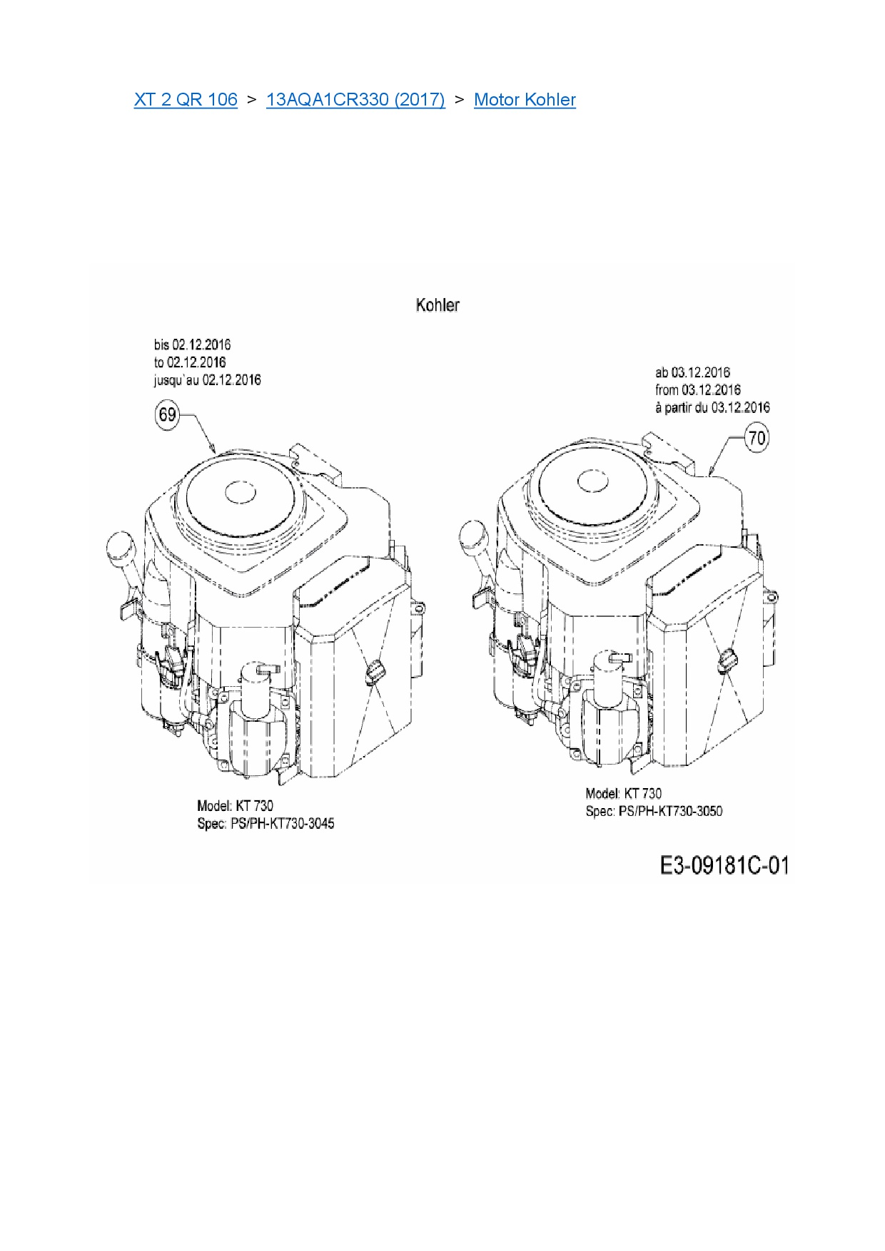 Ersatzteile für Rasentraktor Cub Cadet XT 2 QR 106 aus der Zeichnung Motor Kohler: