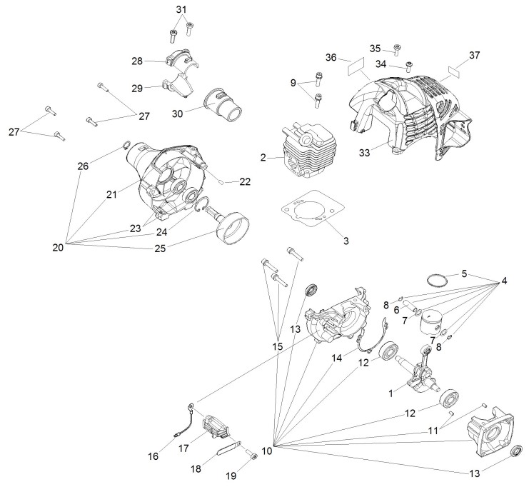 Zeichnung von ECHO Motorsensen SRM-235ESL SRM-235ESL bis S.-Nr.: 37006150 Motor, -abdeckung, Kupplungsgehäuse: