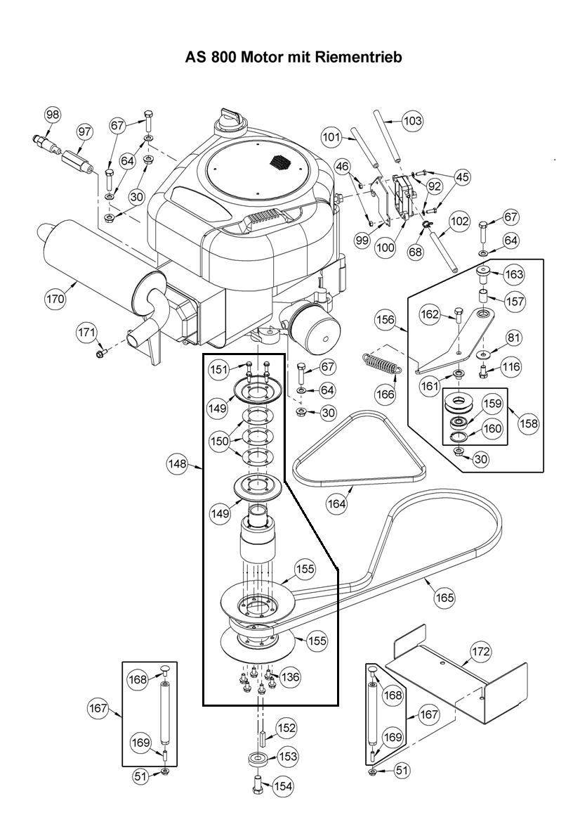 Hier finden Sie alle Ersatzteile von AS-Motor Aufsitzmäher AS 800 FreeRider ab FNr. 016013050001 aus dem Zeichnungsblatt Motor mit Riementrieb: