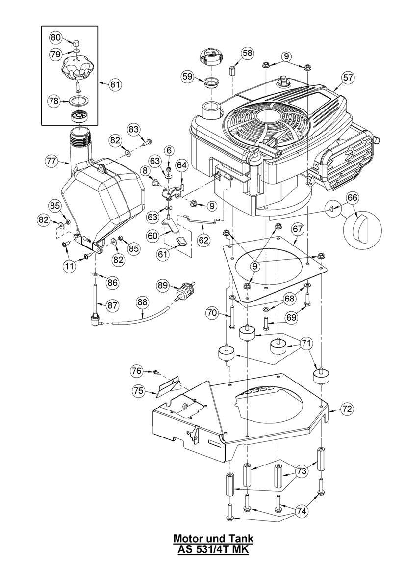 Hier finden Sie alle Ersatzteile von AS-Motor Profi-Rasenmäher AS 531 4T MK und AS 531/4T MK VarioPro ab FNr. 029716100001 aus dem Zeichnungsblatt Motor und Tank: