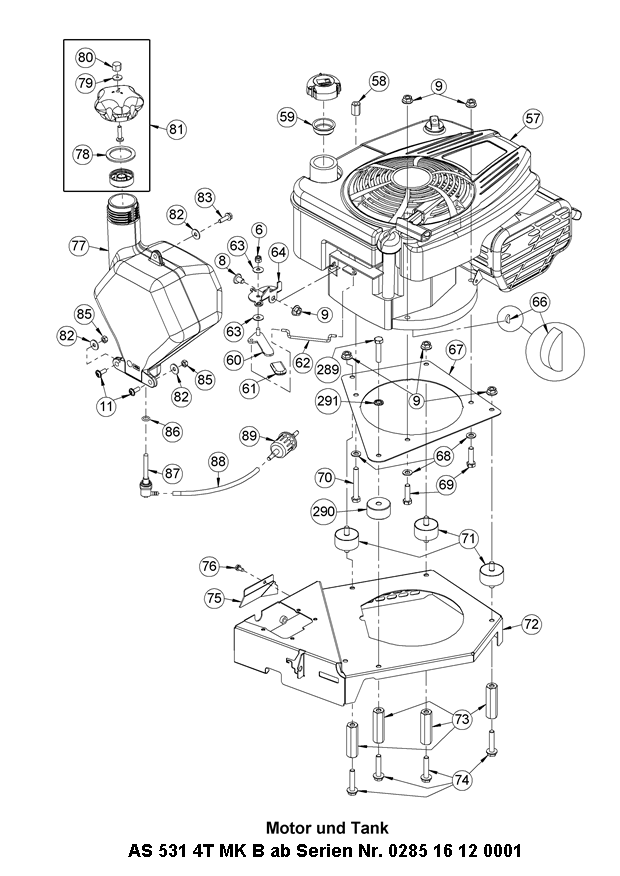 Hier finden Sie alle Ersatzteile von AS-Motor Profi-Rasenmäher AS 531 4T MK B ab FNr. 028516120001 aus dem Zeichnungsblatt Motor und Tank: