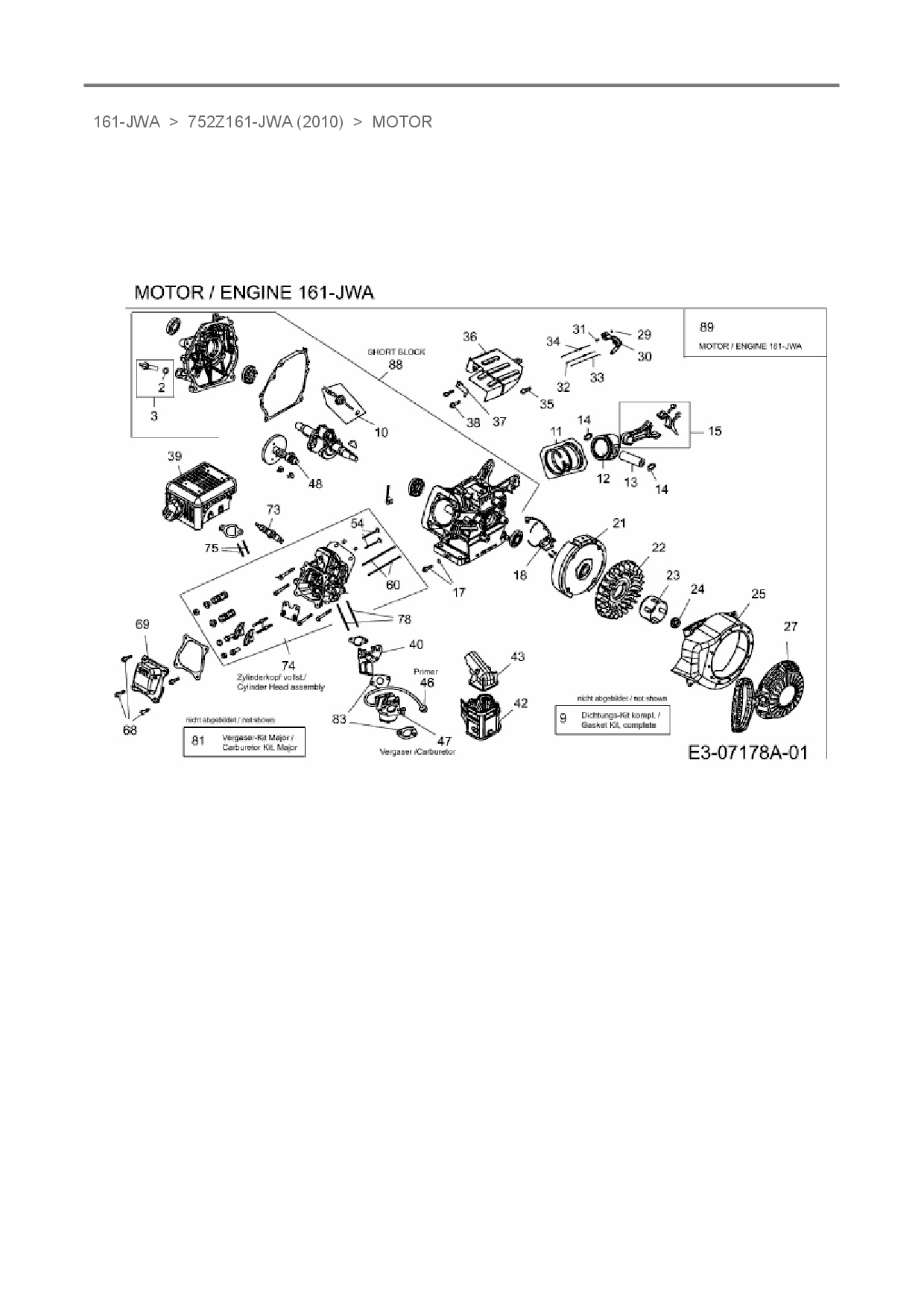 Zeichnung für MTD-Motoren Horizontal 161-JWA mit der Geräte-Artikelnr. 752Z161-JWA ab Baujahr 2010: