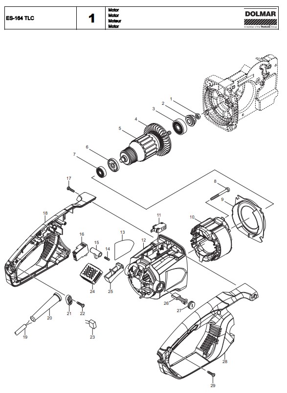 Dolmar Kettensäge ES164TLC Zeichnung: Motor Sollten Sie Fragen zu einem Ersatzteil von Dolmar Kettensäge ES164TLC haben, können Sie uns gerne eine E-Mail (mit einem Foto vom Typenschild Ihres Gerätes) schreiben oder eine Ersatzteilanfrage stellen.