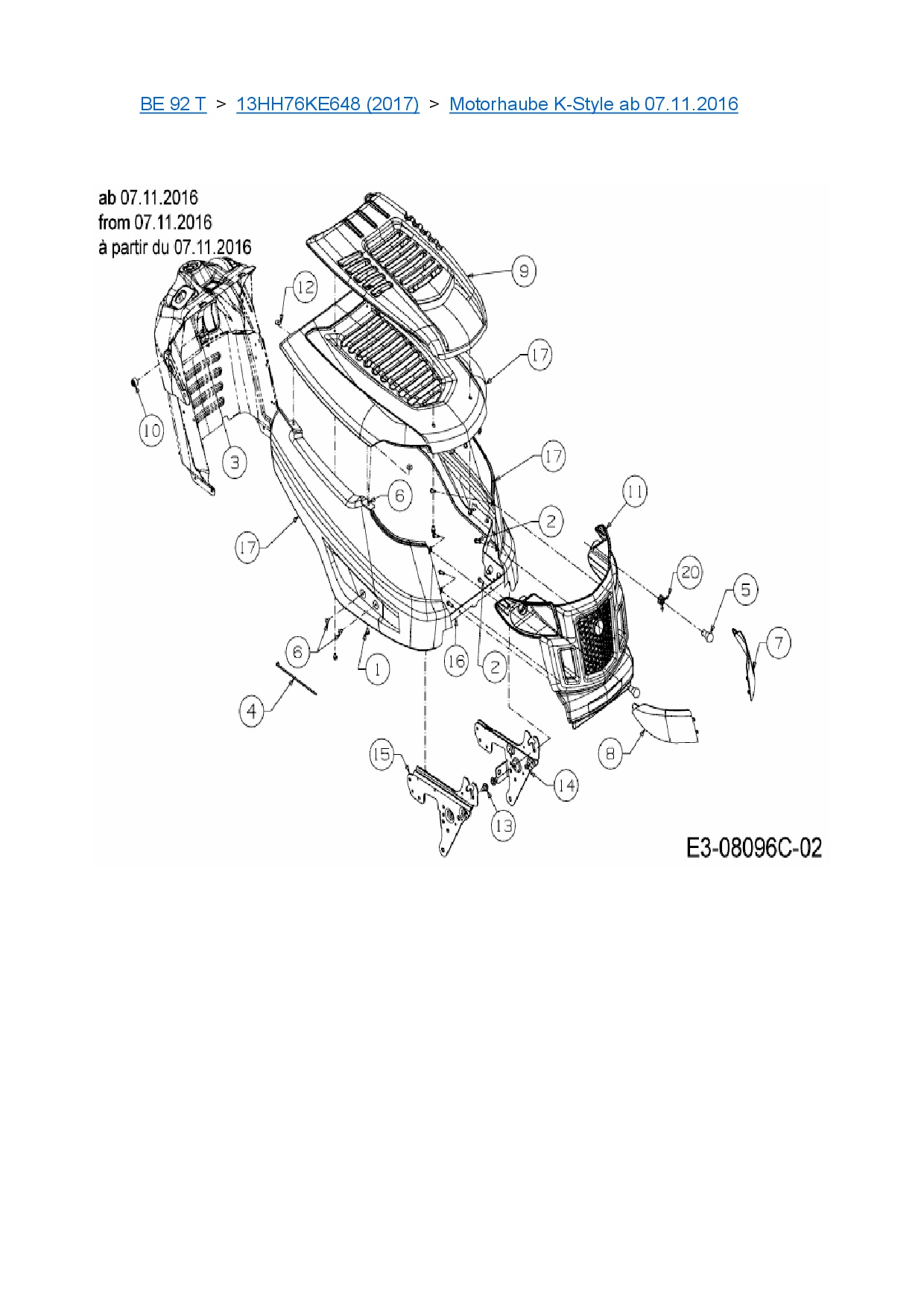 Ersatzteile für Rasentraktor MTD BE 92 T aus der Zeichnung Motorhaube K-Style ab 07.11.2016:
