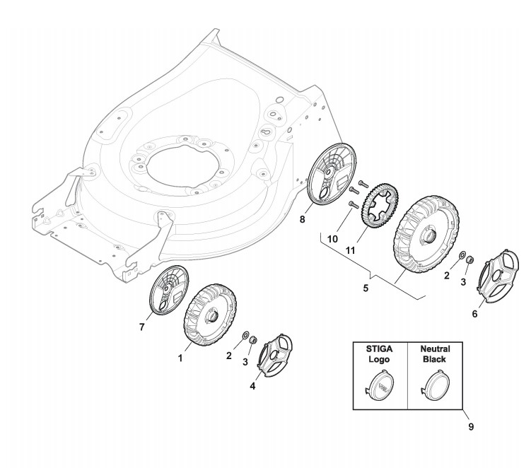 Hier finden Sie alle Ersatzteile von Stiga Benzin-Rasenmäher ab 2020 Twinclip 50 SQ H (Geräte Nr 294512838/ST1) aus dem Zeichnungsblatt Rad und Radkappe: