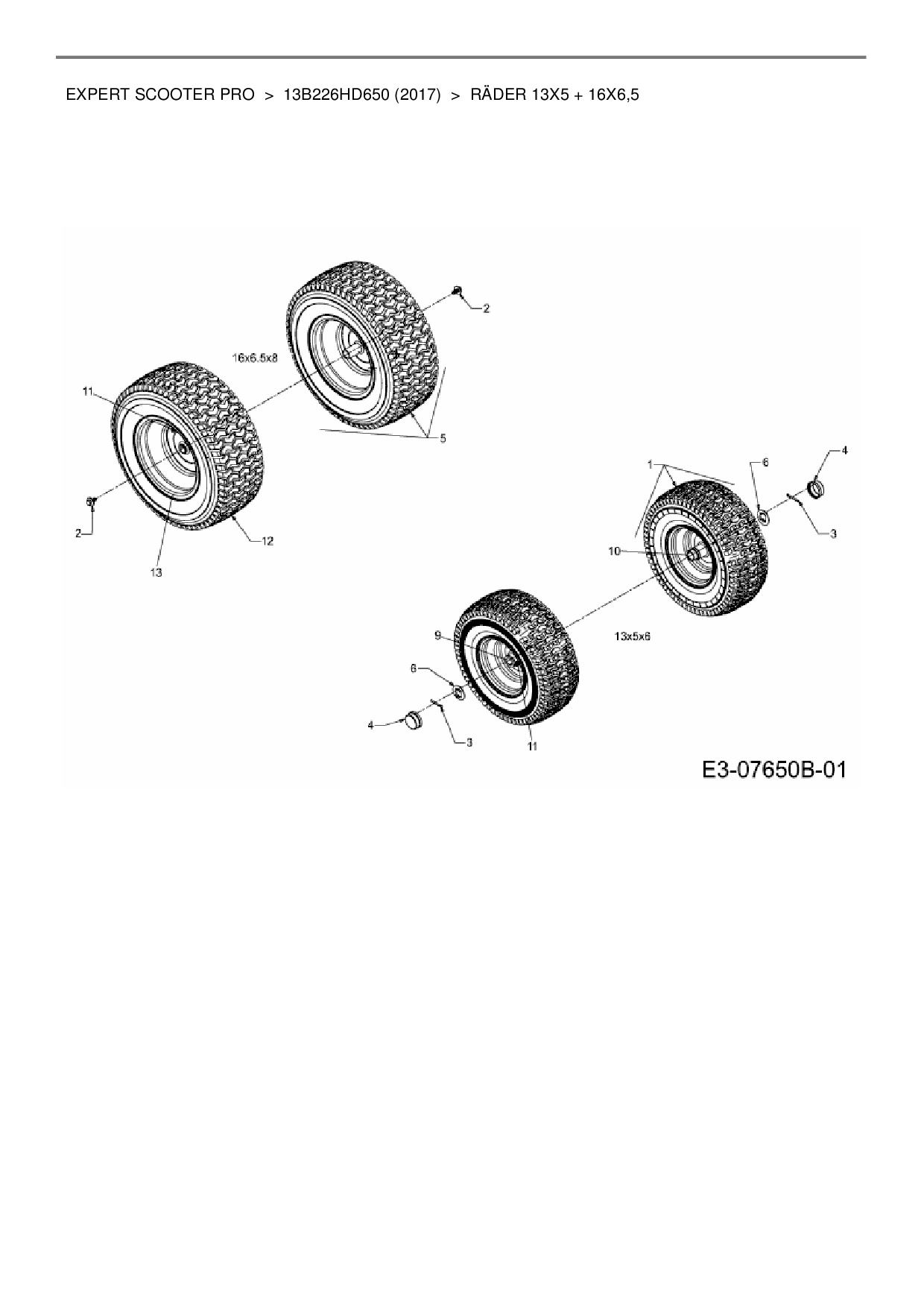 Download Ersatzteil-Zeichnung Wolf-Garten Expert Expert Scooter Pro Zeichnung Räder 13x5 + 16x6,5 (PDF-Format)
