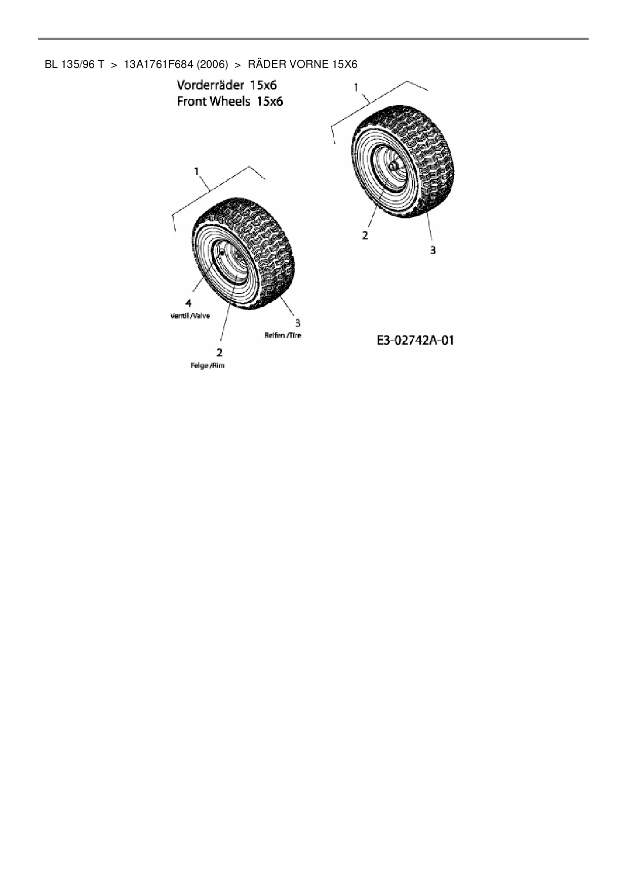 Ersatzteile für Rasentraktor Bolens BL 135/96 T aus der Zeichnung Räder vorne 15x6: