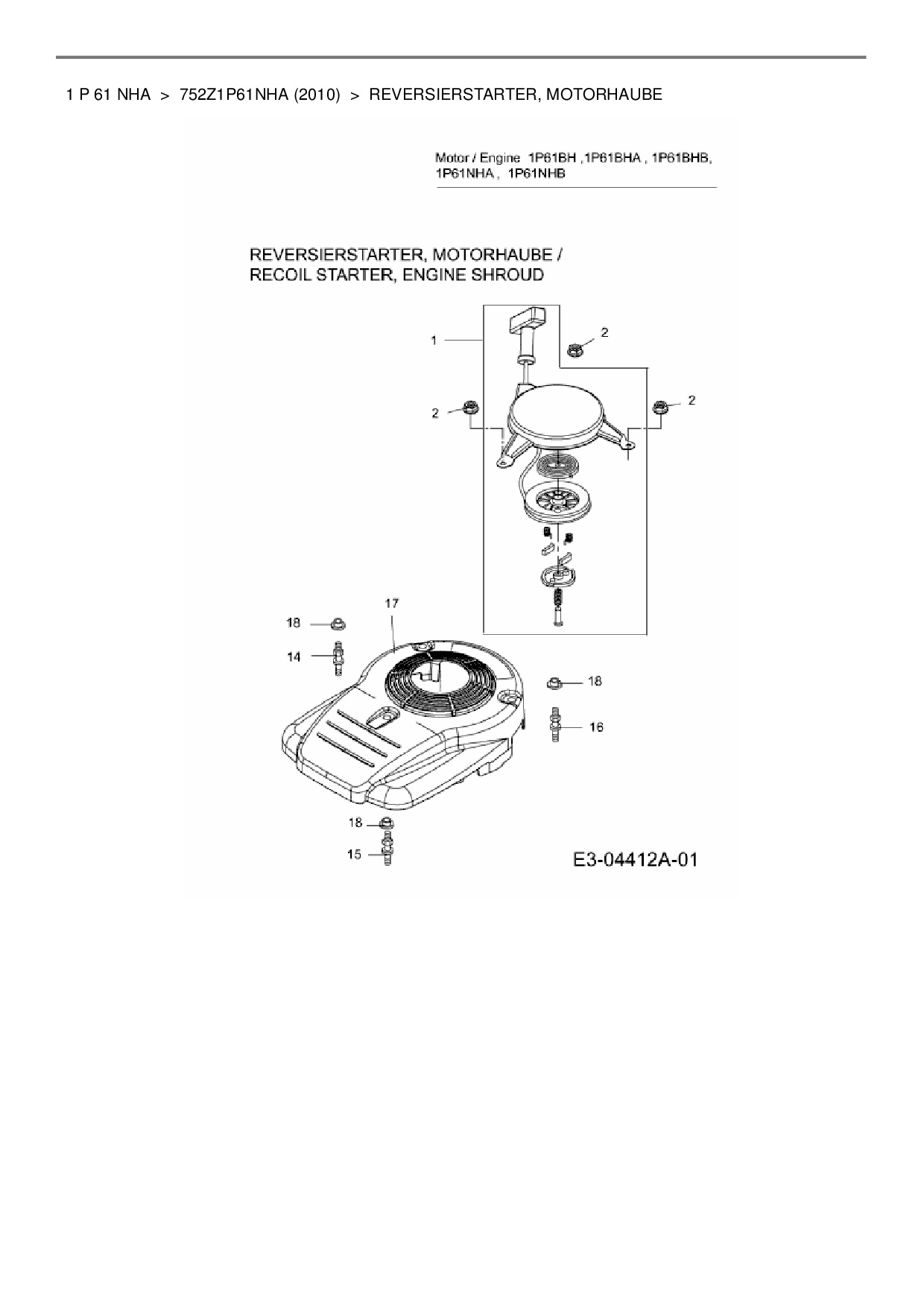 Ersatzteile für Benzinmotor MTD Wolf-Garten 1 P 61 NHA aus der Zeichnung Reversierstarter, Motorhaube: