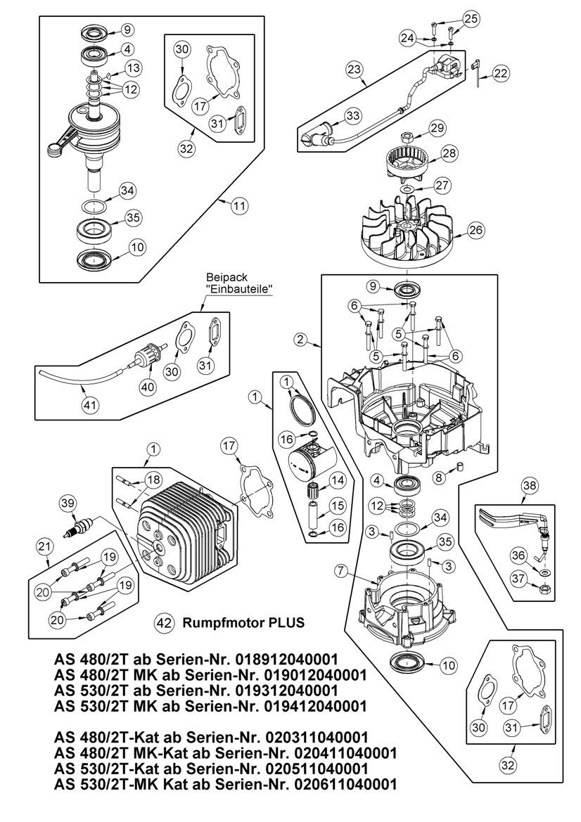 Hier finden Sie alle Ersatzteile von AS-Motor Mulch-Rasenmäher AS 510 2T A und AS 510 A/2T ProClip ab FNr. 024313030036 aus dem Zeichnungsblatt Rumpfmotor PLUS: