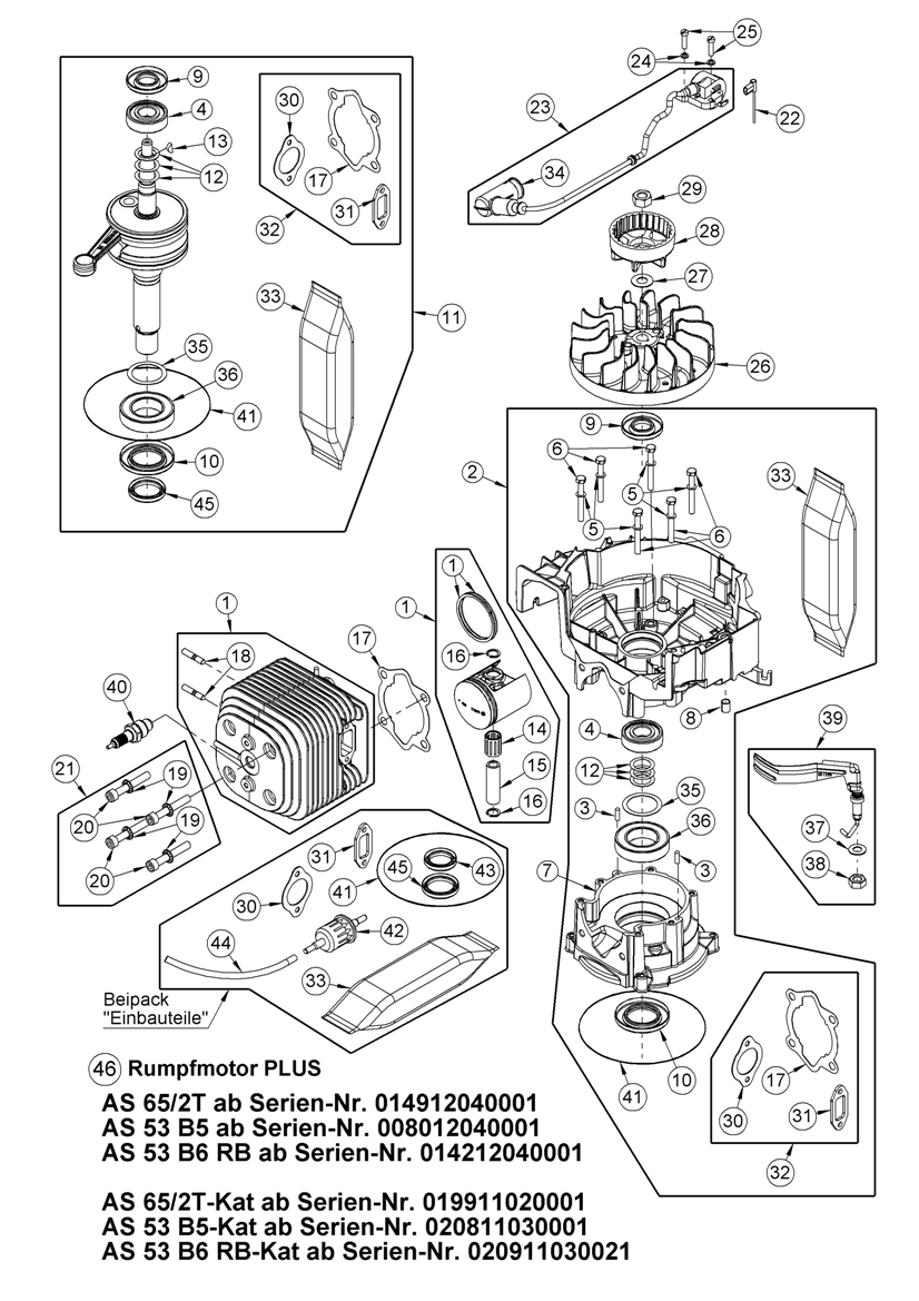 Hier finden Sie alle Ersatzteile von AS-Motor Profi-Rasenmäher AS 53 2T 4WD RB und AS 53 B6 RB-Kat ab FNr. 020913040001 aus dem Zeichnungsblatt Rumpfmotor PLUS: