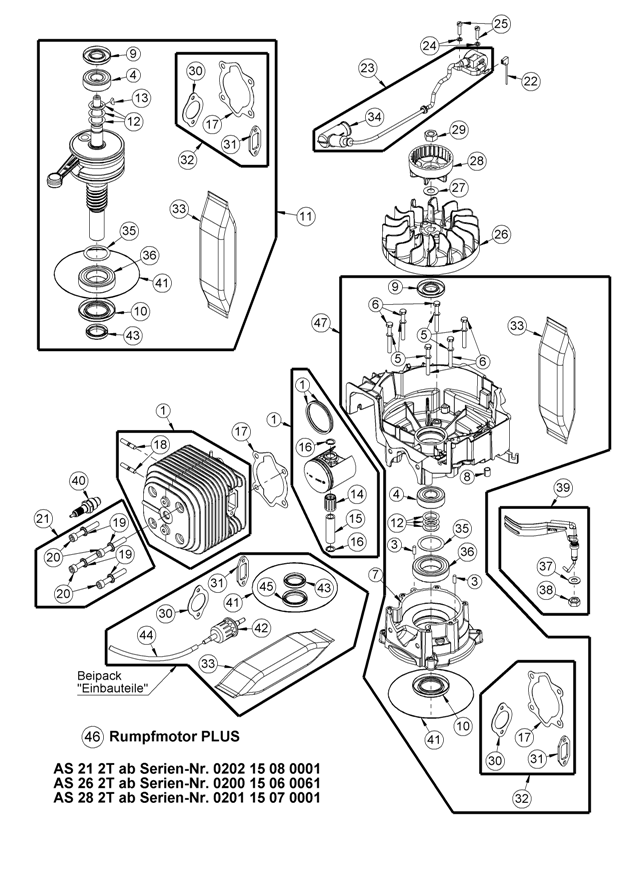 Hier finden Sie alle Ersatzteile von AS-Motor Allmäher AS 28 2T und AS 28/4-Kat ab FNr. 020115070001 aus dem Zeichnungsblatt Rumpfmotor PLUS: