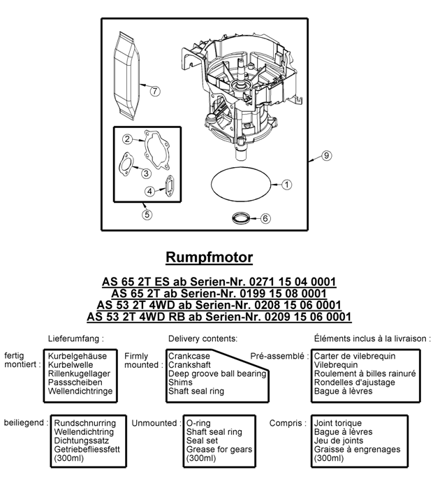 Hier finden Sie alle Ersatzteile von AS-Motor Allmäher AS 65 2T und AS 65/2T-Kat ab FNr. 019915080001 aus dem Zeichnungsblatt Rumpfmotor: